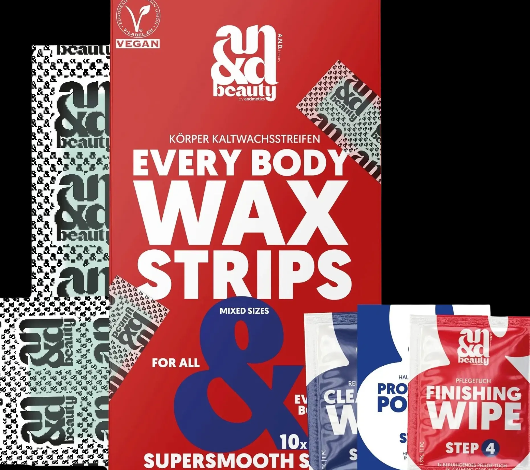 A.N.D. Beauty Every Body Wax Strips on nopea ja tehokas koko vartalon karvanpoistoratkaisu, jossa eri kokoiset käyttövalmiit kylmävahaliuskat poistavat karvan juuresta niin jaloista, käsistä ja muilta alueilta, ja mukana tuleva Micellar Wipe viimeistelee ihon sileäksi ja puhtaaksi ilman tahmaa.