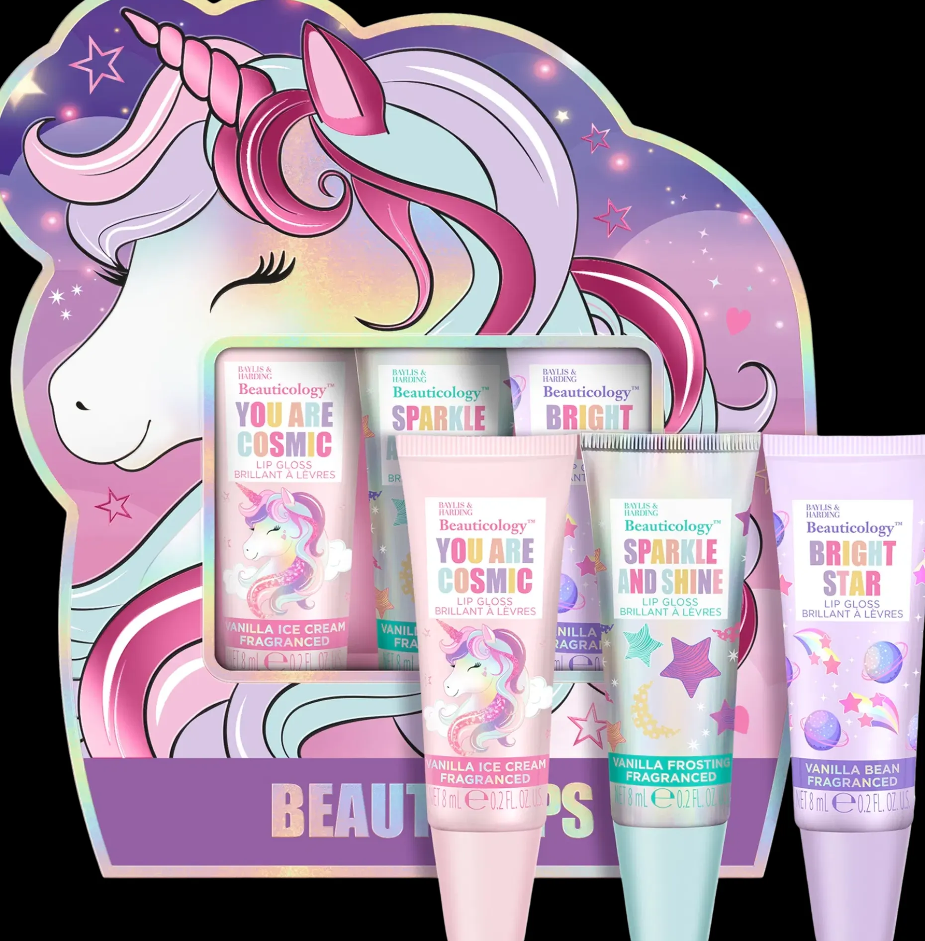 Karkkimaisia tuoksuja sisältävä kokoelma hurmaa suloisuudellaan ja siivittää suoraan juhlatunnelmaan täynnä sateenkaaren kiiltoa, pastellisävyjä sekä suloisia eläinystäviä. Pakkaukseen kuuluu 2 x 65 g Unicorn Candy -kylpysuolaa, 2 x 65 g mansikkakarkin tuoksuista kylpysuolaa ja 65 g hattaran tuoksuista kylpysuolaa.