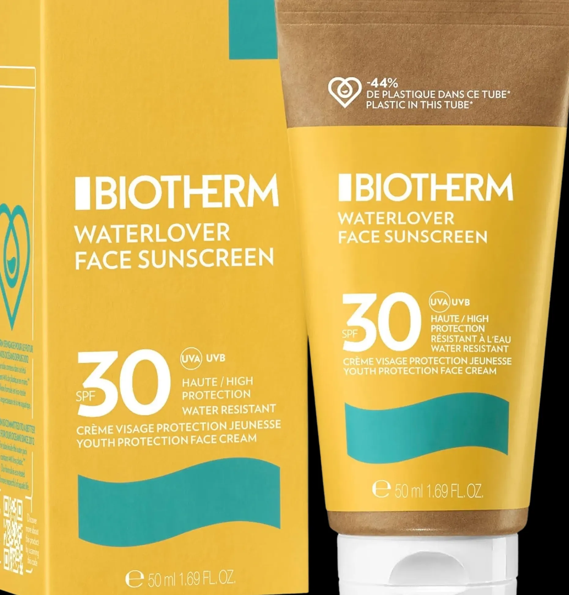 Biotherm Waterlover Sunscreen SPF30 kasvoille on aurinkovoide kestävässä paperipohjaisessa putkilossa. Sopii kaikille ihotyypeille. Suojaa tehokkaasti auringon säteilyltä (UVA & UVB). Sisältää E-vitamiinia ja antioksidantteja, jotka vaikuttavat ihoa parantavasti ja suojaavat ikääntymisprosessia kiihdyttäviltä vapailta radikaaleilta. Sisältää myös anti-age-aurinkosuodattimen, joka vähentää pigmenttimuutosten/pigmenttiläiskien syntymisen riskiä. Voiteen koostumus imeytyy ihoon nopeasti jättämättä valkoisia jälkiä. Sisältää sitrusuutteiden tuoksunuotteja.