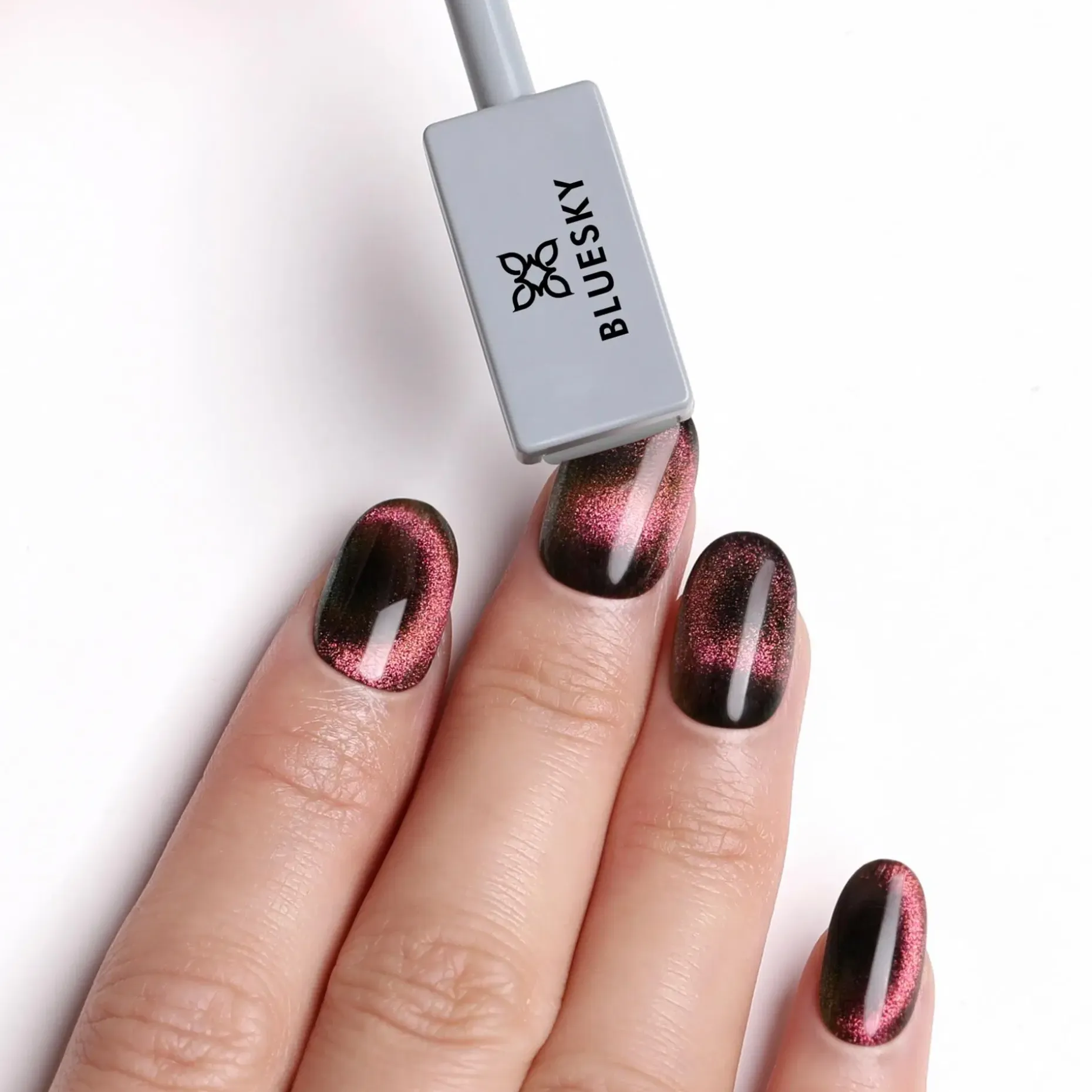 När du har applicerat ditt valda Cat Eye-gellack, härda det inte. Ta en magnet och håll den nära din nagel. Du kommer att se hur de magnetiska pigmenten rör sig på din nagel. Du kan flytta magneten i olika riktningar för att skapa den effekt du vill ha. Om du inte är nöjd med resultatet kan du applicera lacket igen ovanpå din nagel, vilket kommer att återaktivera lacket. När du är nöjd, härda gellacket.