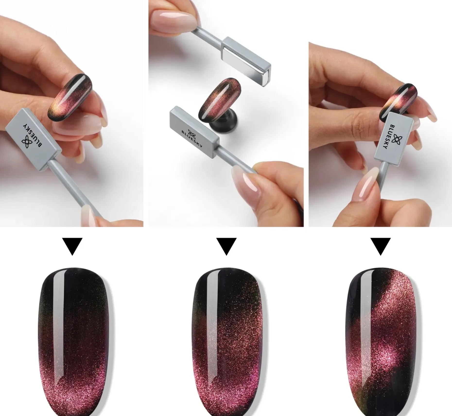 Näet, kuinka magneettiset pigmentit liikkuvat kynnellä. Voit liikutella magneettia eri suuntiin luodaksesi haluaman efektin.