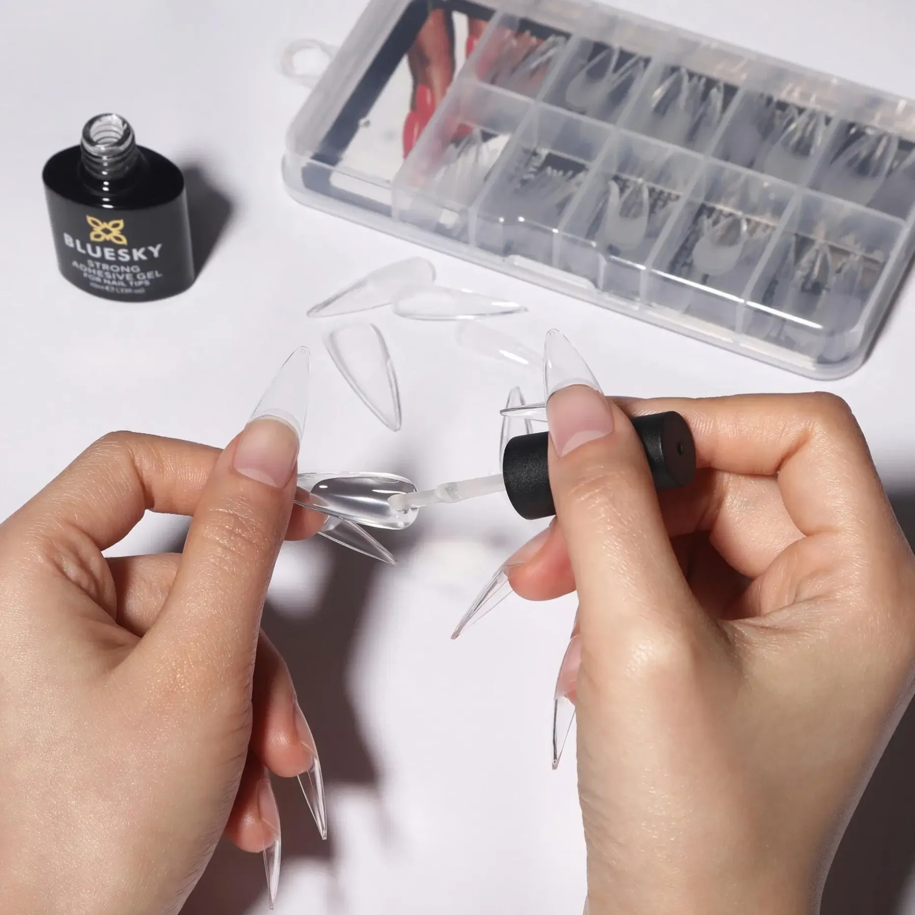 9. Laita Strong Adhesive geeliliimaa tipin sisäpuolelle. Paina tippi kynnelle aloittaen kynsinauharajasta. Varmista, ettei tipin alle muodostu ilmakuplia.