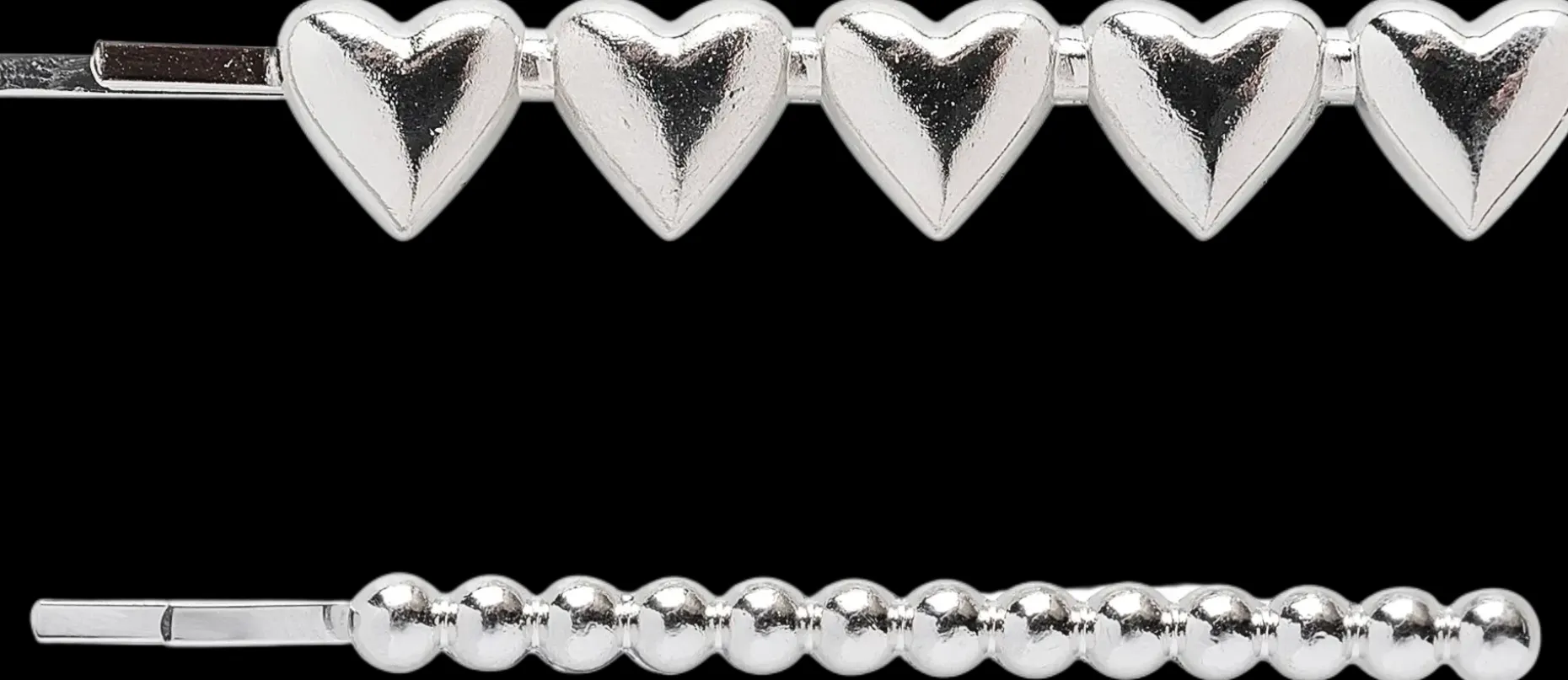 2 kpl hopeanvärisiä hiuspinnejä. Toisessa pinnissä sydän- ja toisessa pallokuvio. Yhden pinnin pituus n. 6,5 cm.