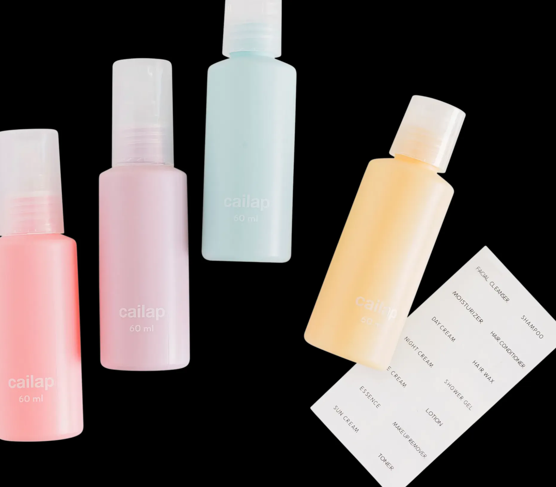 Matkapullot 4 kpl pastellisävyissä. Pakkaus sisältää 2 x täyttöpullot 60 ml, spraypullon 60 ml ja pumpullisen täyttöpullon 60 ml. Pullon tilavuus painettu pullon etupuolelle. Mukana sisältötarrat, jotka voit liimata pulloihin.