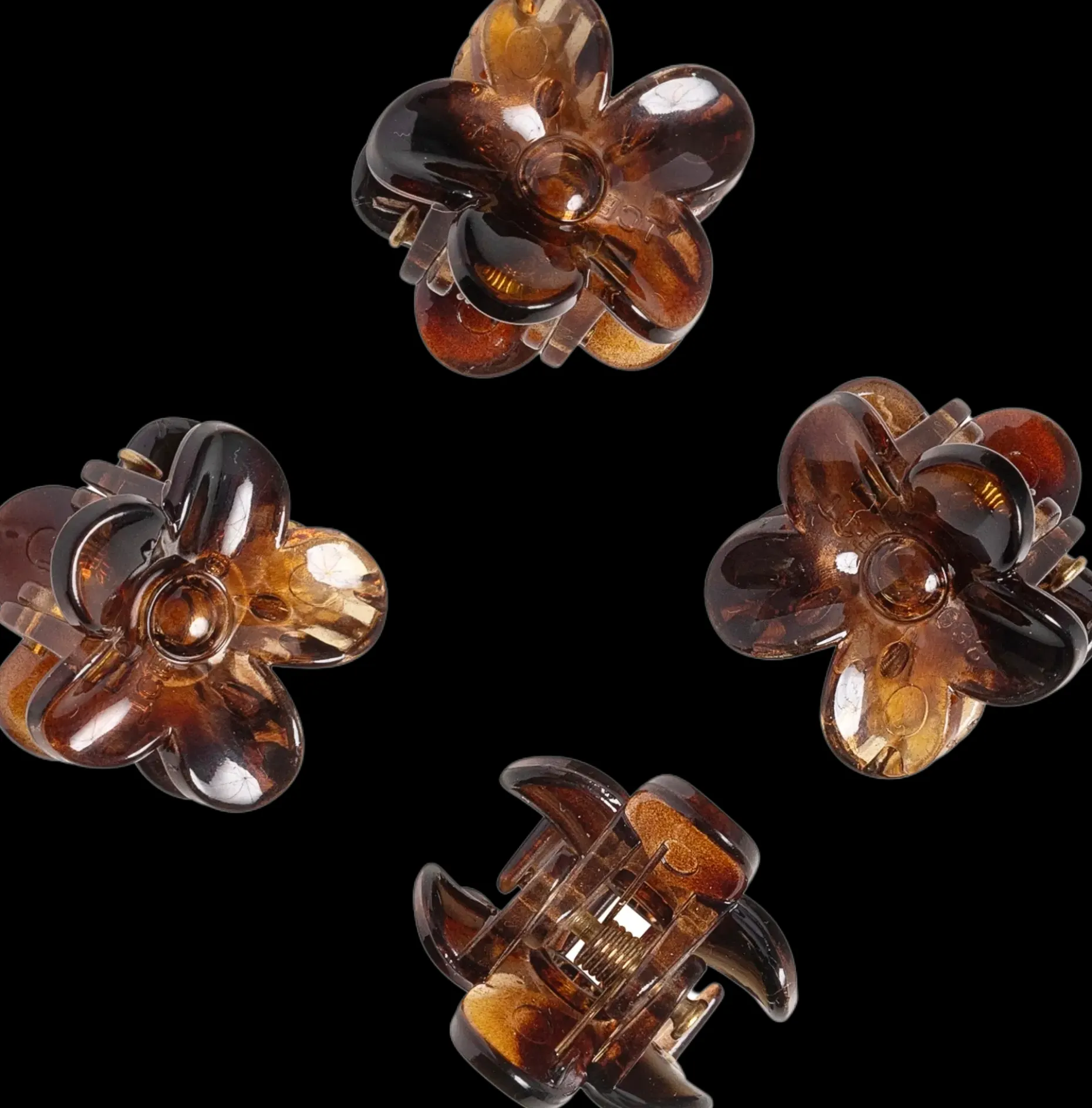 Kauniit kukkahiussoljet koristamaan kampausta. Setissä 4 kpl kukanmuotoisia hiussolkia. Ruskeansävyisten solkien halkaisija noin 2 cm.