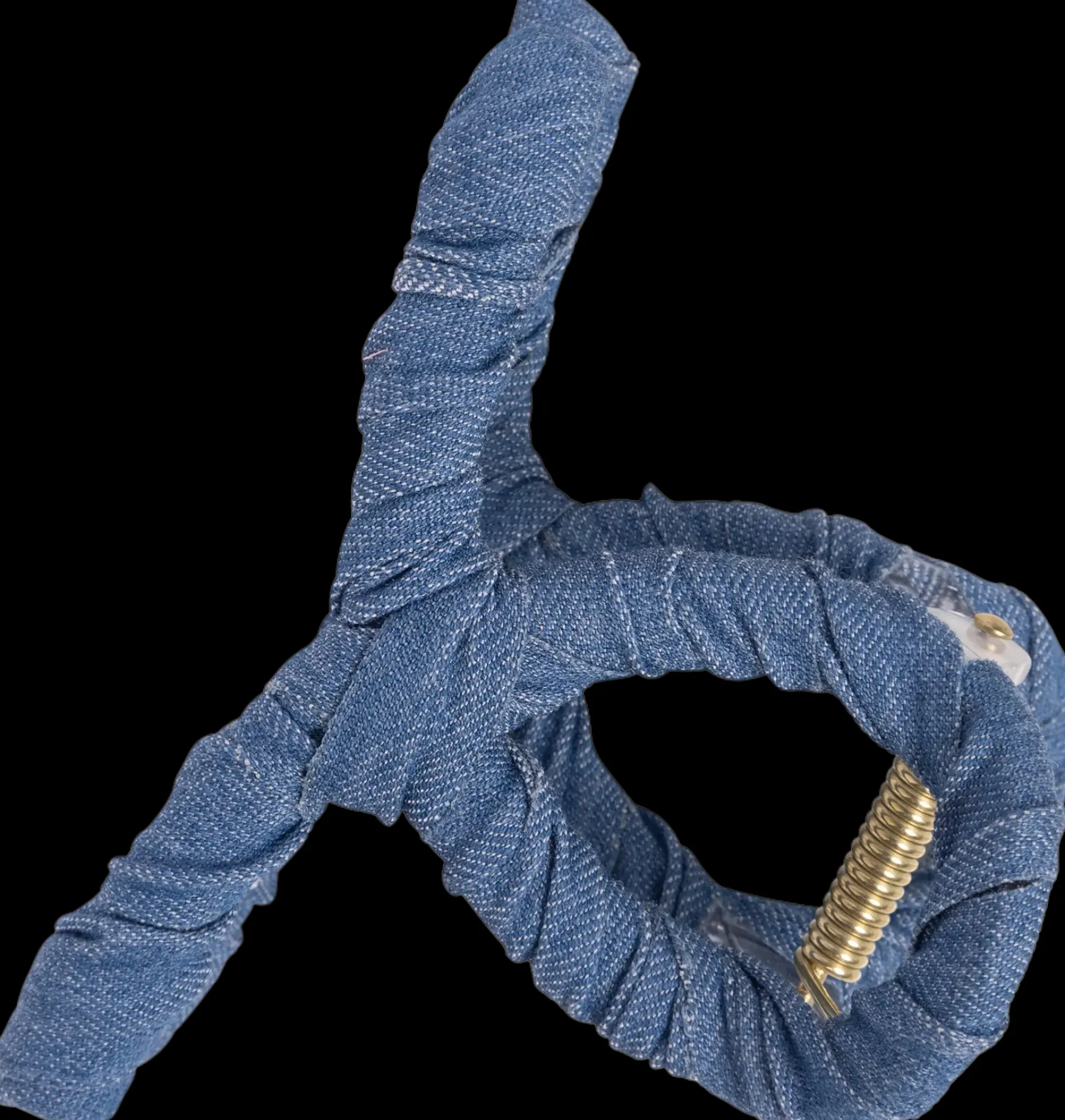 Trendikäs punottu hiussolki. Farkun sinisen hiussoljen leveys noin 8 cm.