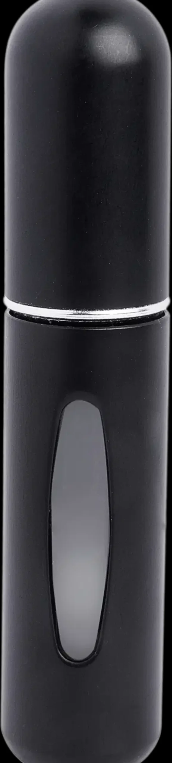 Täytettävä alumiininen parfyymipullo, tilavuus 5 ml. Täytä matkakokoinen parfyymipullo vaivattomasti suihkuttamalla tuoksua pohjan silikoniaukon lävitse. Irrota hajuvedestäsi sumutekorkki, aseta putki täyttöpullon pohjaan olevaan reikään ja painele täyttöpulloa alaspäin. Täyttöpullo täyttyy painelemalla, pullon reunasta näkyy kuinka paljon hajuvettä pullossa on. Täytettävä parfyymipullo on helppo ottaa matkalle mukaan. Huom! Soveltuu yleisimmin käytössä olevien n. 3 mm kokoisista suuttimista täyttämiseen. Ei sovellu 4 mm tai siitä isommista suuttimista täyttämiseen!