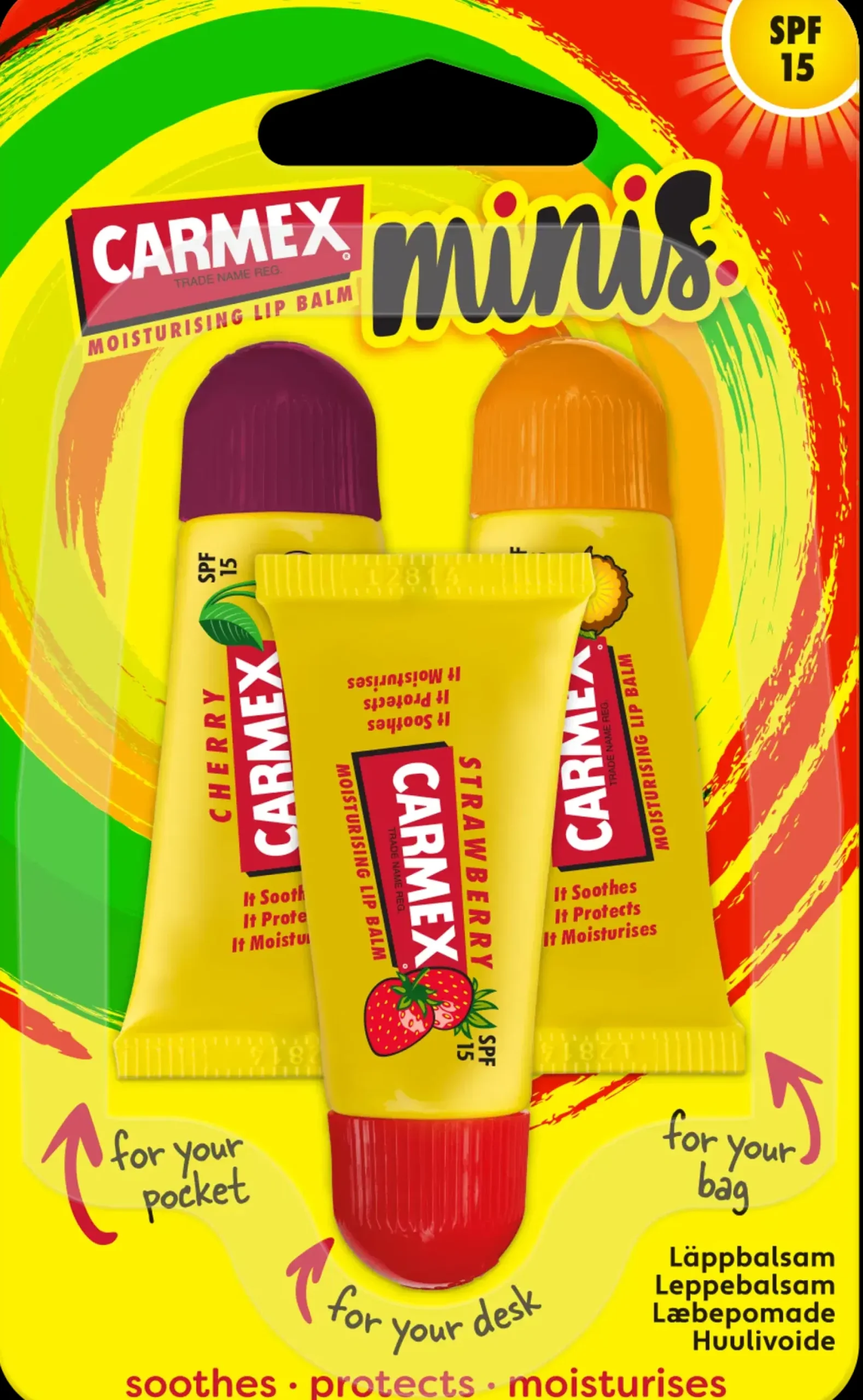 Carmex Minis, jotka ovat kooltaan pieniä, mutta maultaan suuria. 3 hedelmäistä makua, mansikka-, kirsikka- ja ananasminttua. Rauhoittaa, ravitsee ja kosteuttaa huuliasi suojakertoimella SPF 15