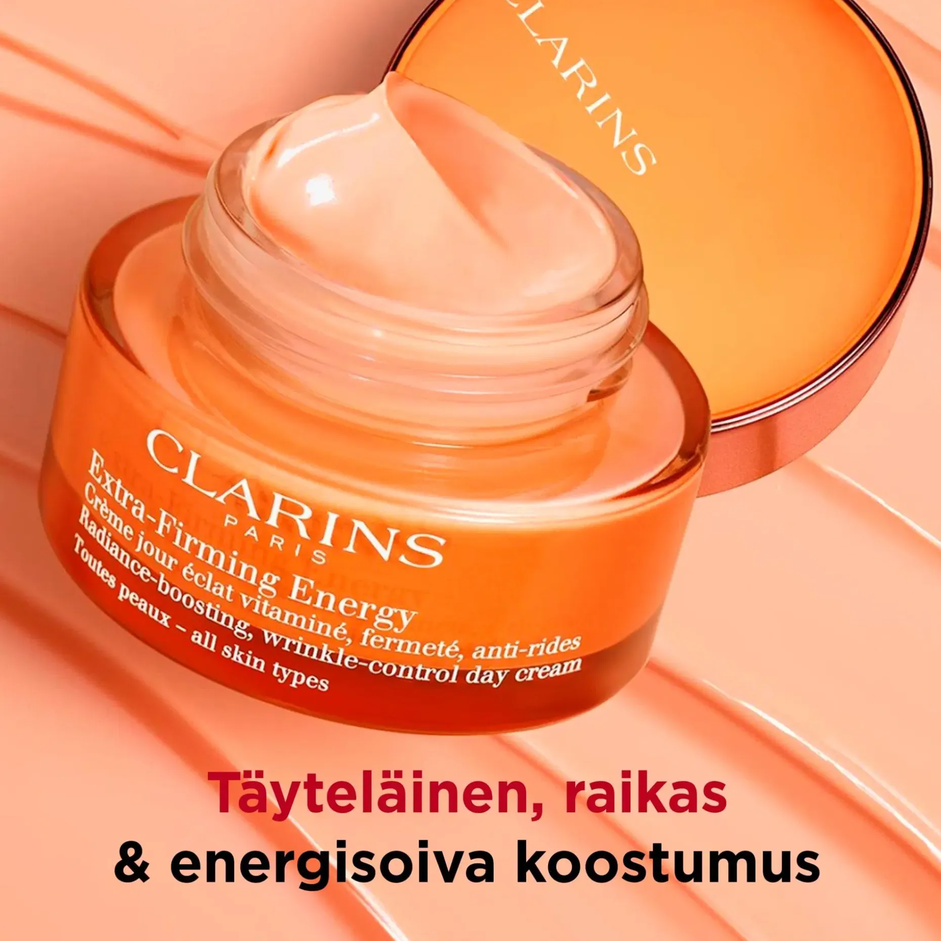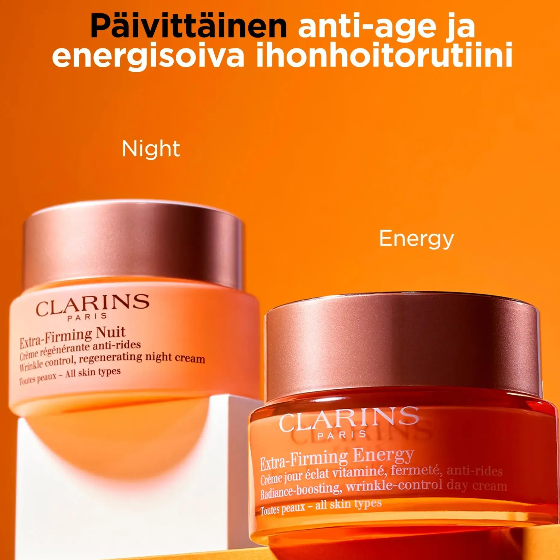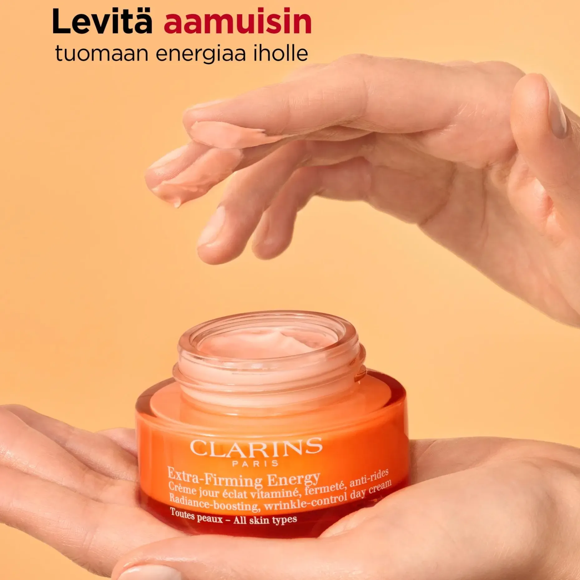 Heleyttävä, juonteita silottava päivävoide. Clarins Extra-Firming Energy on kiinteyttävä päivävoide, jonka kevyesti sävytetty koostumus kaunistaa ja heleyttää ihoa välittömästi. Päivävoide sisältää ihon energian tuotantoa tukevan, ihoa heleyttävän sekä ihoa ravitsevan kasviperäisen Glow Plus Complexion –yhdisteen. Päivä päivältä iho on kosteampi, kiinteämpi ja hehkuvampi sekä täynnä energiaa.