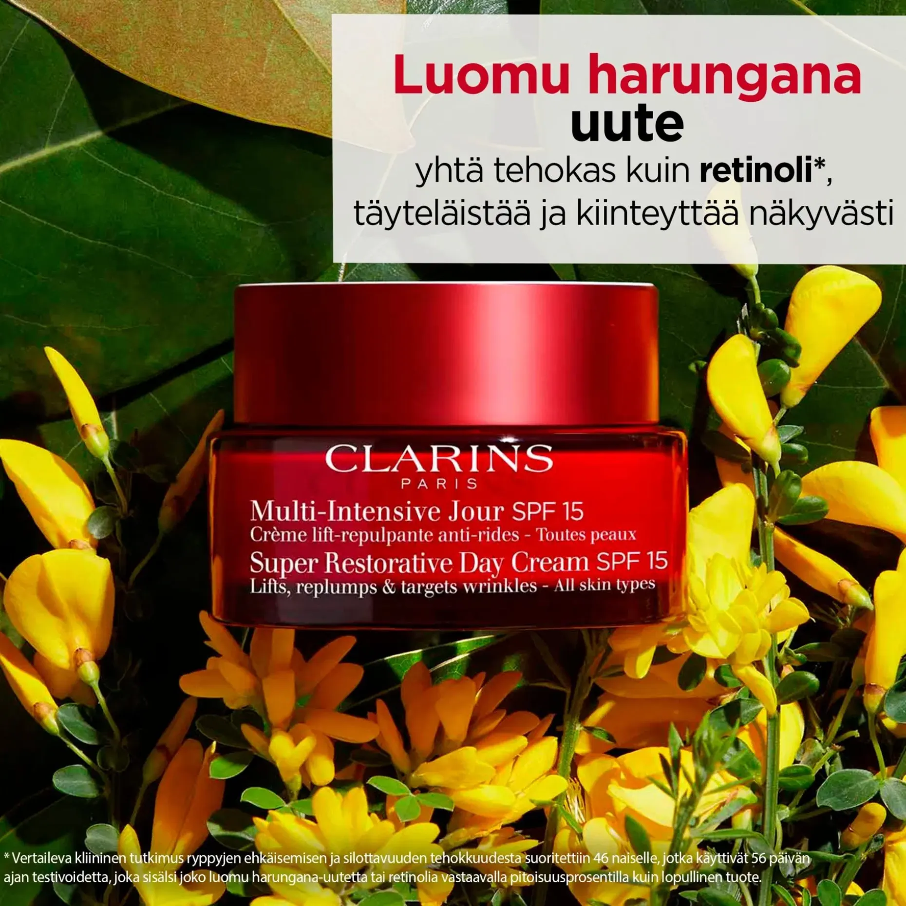 Clarins Super Restorative -ihonhoitolinjan hoitovoiteet hoitavat hormonaalisista muutoksista johtuvia, pitkälle edenneitä ikääntymisen merkkejä. Hoitovoiteiden täyteläiset koostumukset saavat ihon näyttämään sileämmältä ja kiinteämmältä. Päivä päivältä iho näyttää aiempaa ravitummalta ja nuorekkaan hehkuvalta. Ihonhoitolinjan tuotteet vastaavat ihon erityistarpeisiin tehokkaasti päivin ja öin. Super Restorative -hoitovoiteissa on miellyttävät pehmeät koostumukset ja puuterinen kukkaistuoksu, jossa vivahde hedelmiä ja vaniljaa.