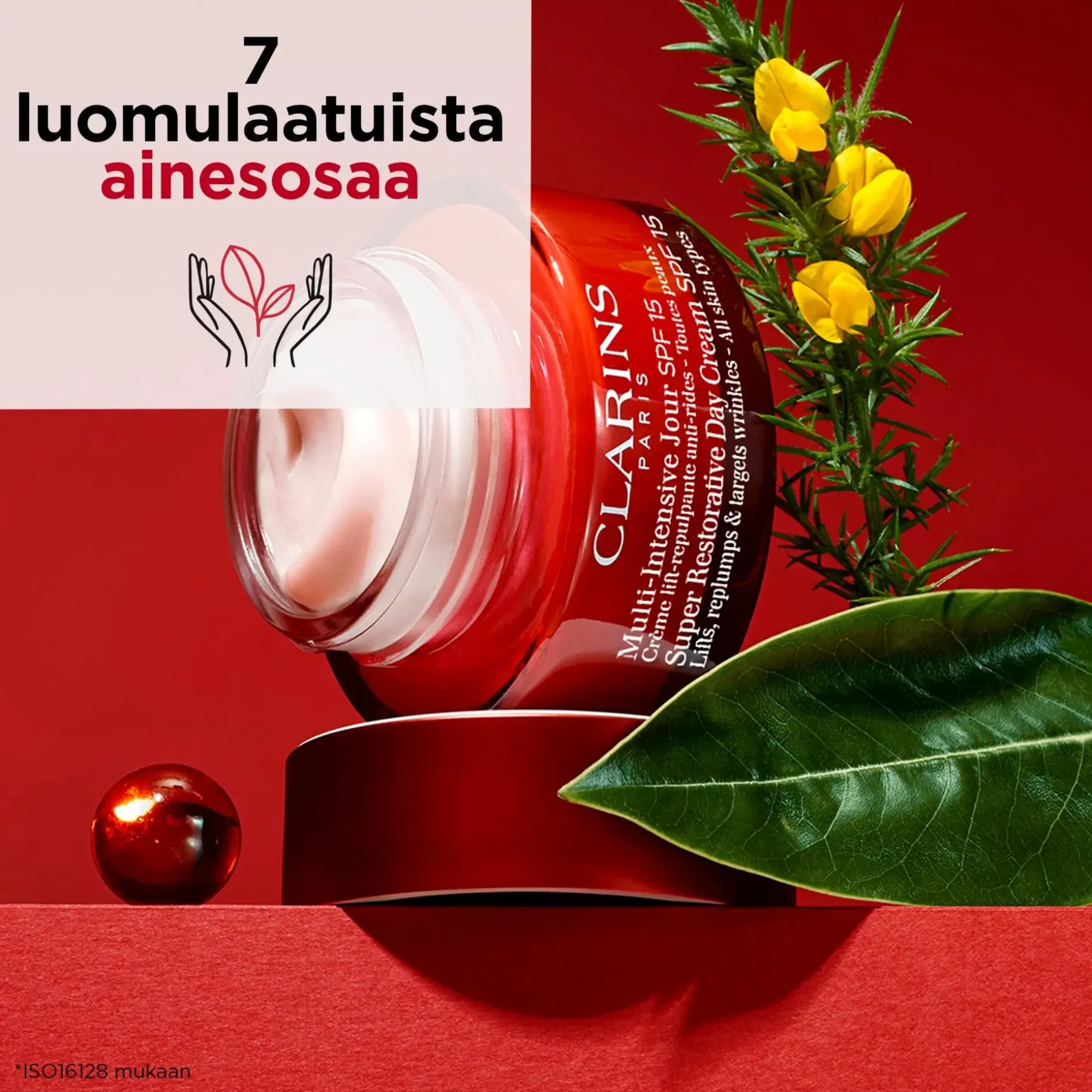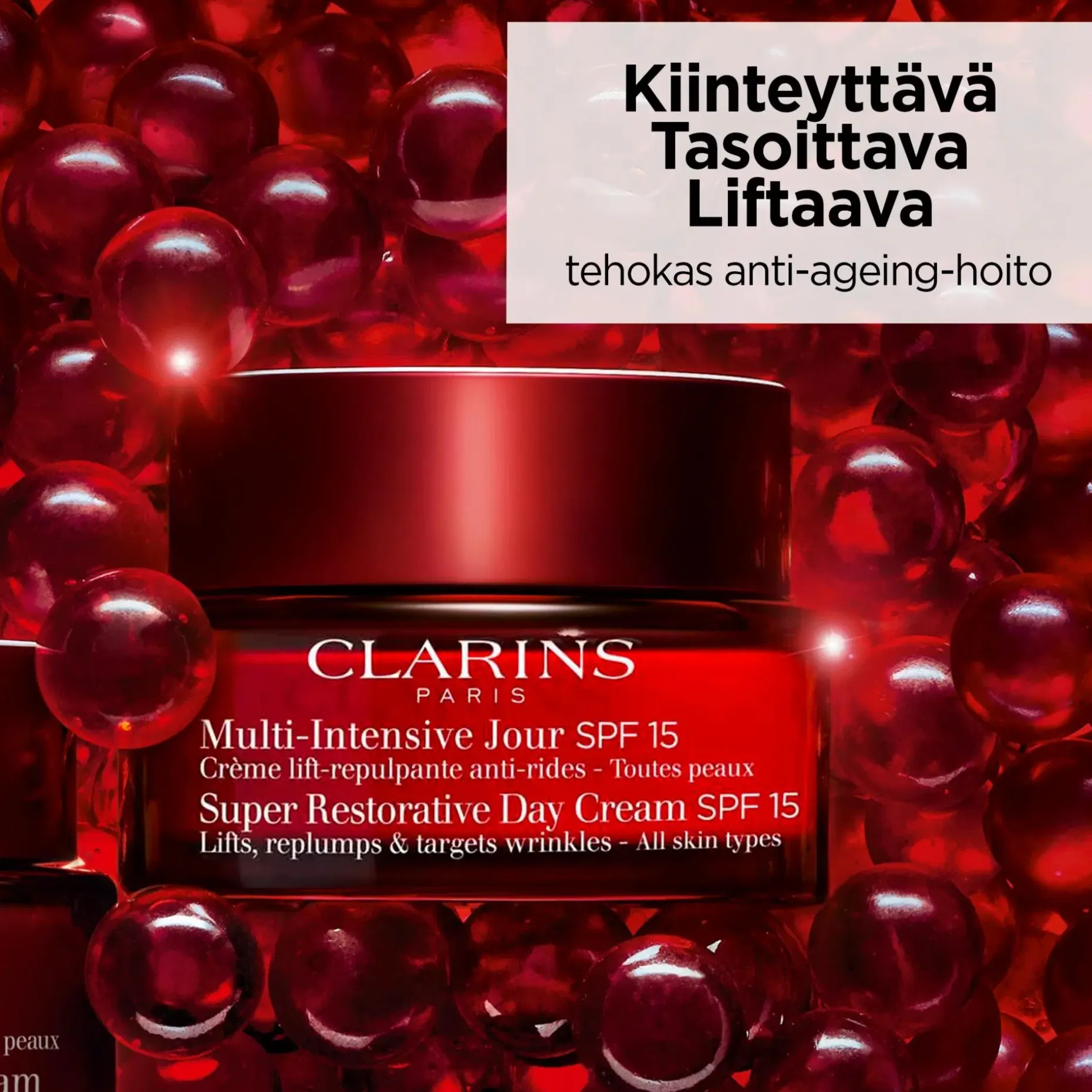 Clarins Super Restorative Day Cream SPF 15 -päivävoide kaikille ihotyypeille. Luomu harunganauute ja piikkiherneuute muodostavat ihoa hoitavan duon, joka uudistaa ja liftaa ihoa. Super Restorative -päivävoiteen sisältämä kasviperäinen skvalaani suojaa kasvojen ihoa ulkoisilta ärsykkeiltä vahvistaen ihon luontaista hydrolipikalvoa. Lisäksi päivävoiteen sisältämä SPF 15 suojaa ihoa auringon UVA ja UVB säteiltä.