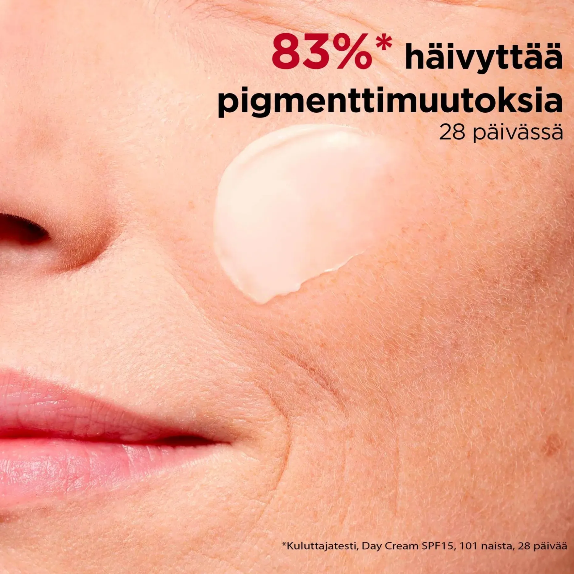 Levitä päivävoidetta kevyesti painellen aamuisin puhtaalle kasvojen ja kaulan iholle. Aloita kasvojen keskeltä ja siirry kohti reunoja.