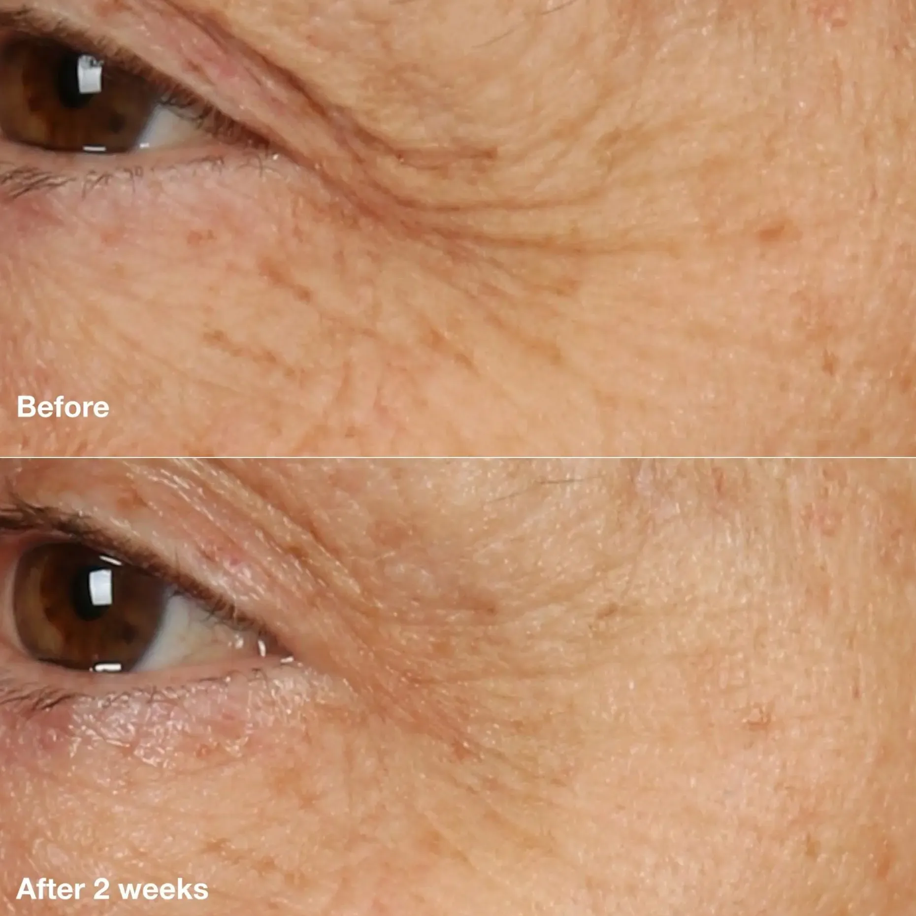 **Kasvojen juonteet viittaavat silmäkulmaryppyihin. Kliiniset testit 33 naisella tuotteen kahden viikon ajan käytön jälkeen.