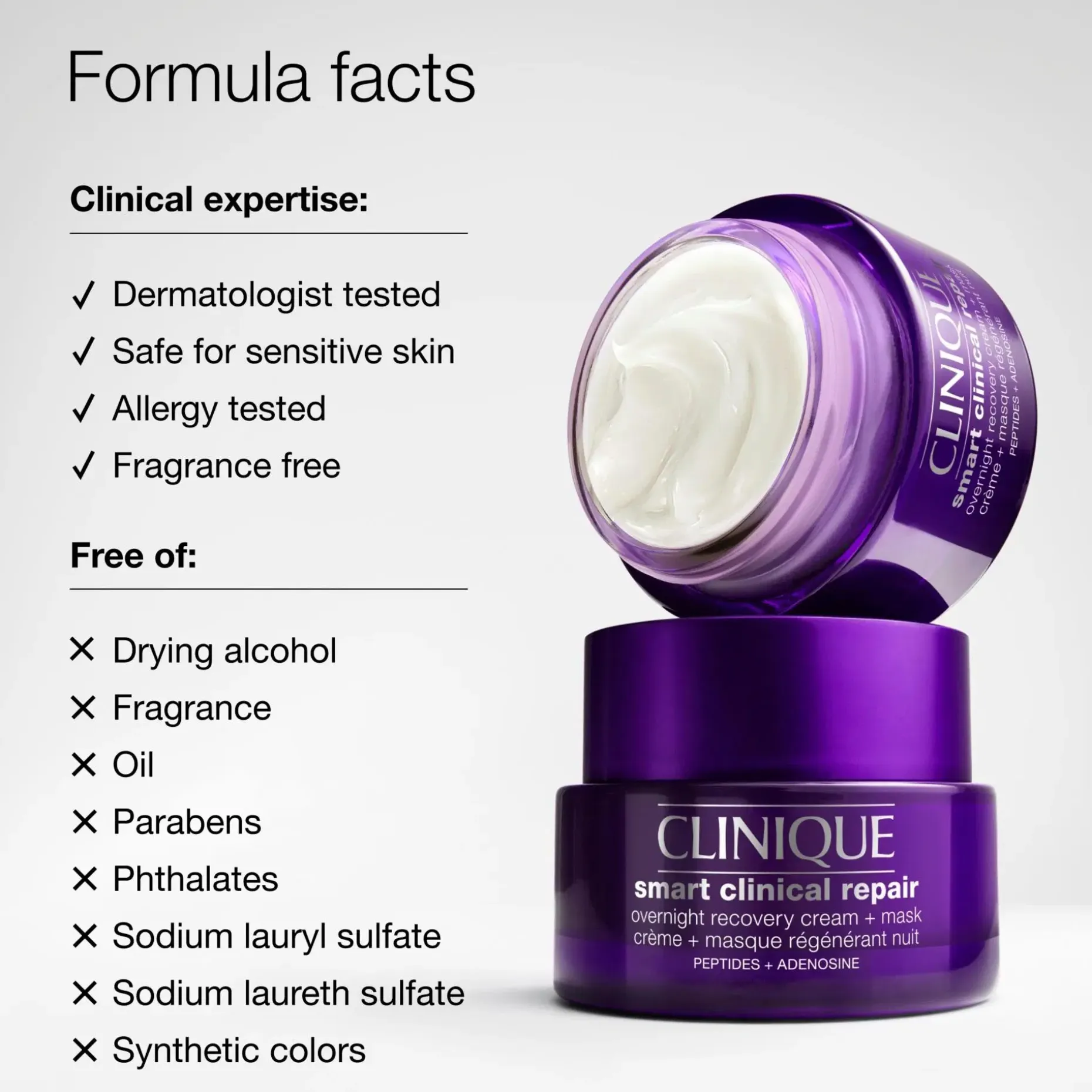 Smart Clinical Repair Overnight Recovery Cream and Mask -voide yhdistää yövoiteen ja yönaamion yhdeksi tuotteeksi. Tehotuote häivyttää kasvojen ja kaulan näkyviä juonteita ja ryppyjä, auttaa palauttamaan ihon suojamuurin ja rauhoittaa näkyvästi herkkyyttä. Kaiken tämän lisäksi se tuo iholle syvää kosteutusta yön aikana. Voide optimoi ihon luonnollisen yön aikana tapahtuvan uudistumisprosessin, vähentäen näkyvästi juonteita ja ryppyjä ja rauhoittaen herkkyyden ilmettä.
