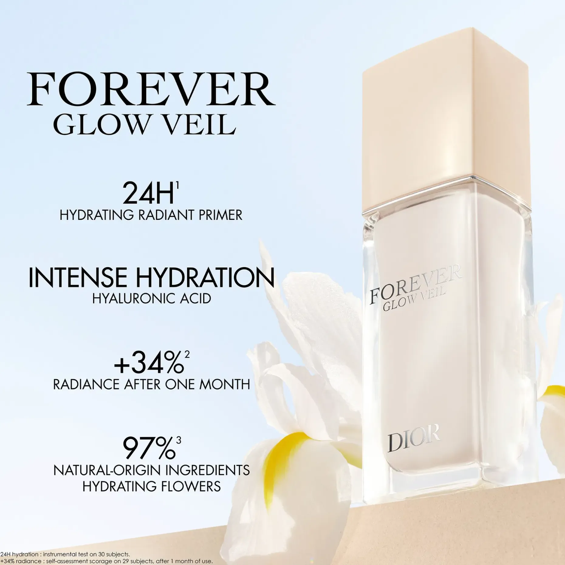Dior Forever Glow Veil Primer -meikinpohjustusvoide sisältää kosteuttavaa seerumia ja 100 %**** luonnollista alkuperää olevaa hyaluronihappoa. Se kosteuttaa ihoa tehokkaasti ja antaa iholle välitöntä hehkua. Ihosta tulee heleä ja tasainen.
