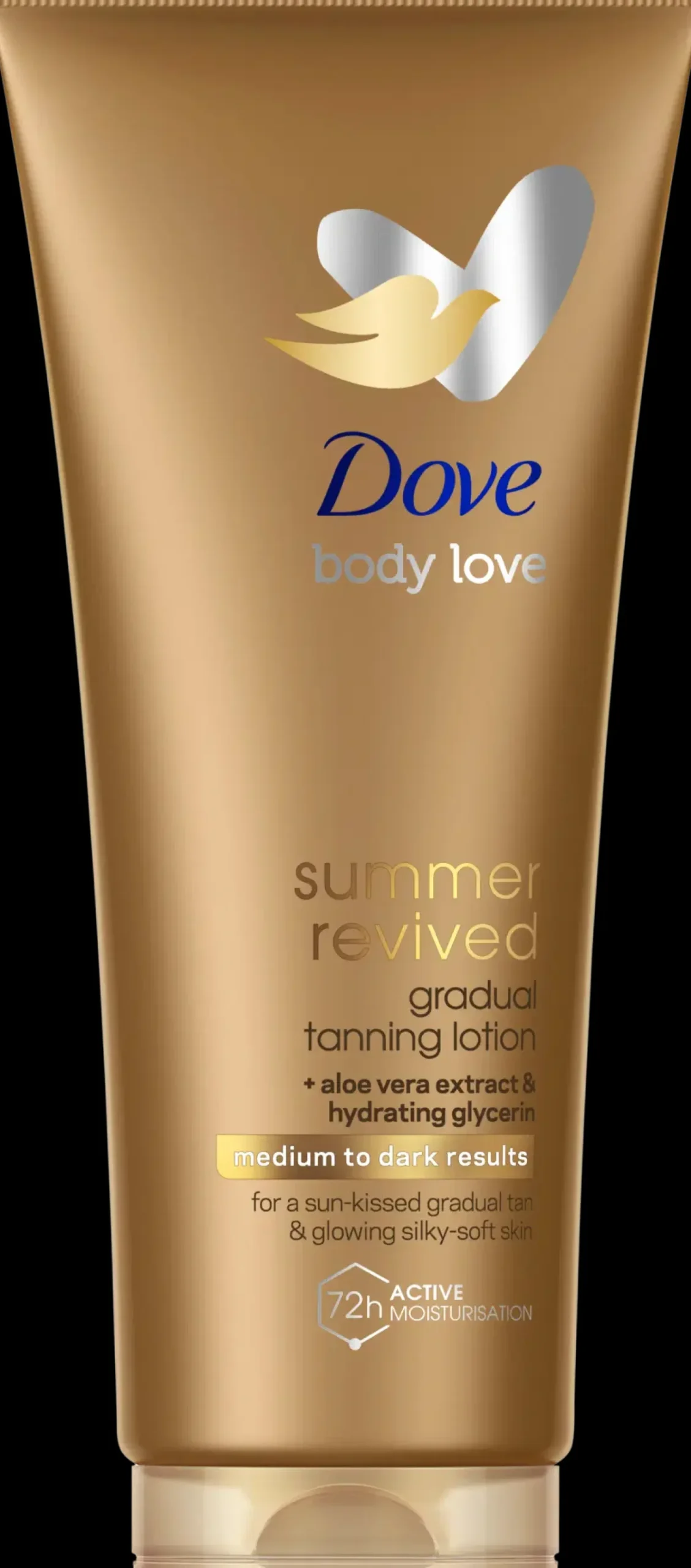 Dove Summer Revived -itseruskettava kosteusvoide sopii kaikille ihotyypeille, myös herkälle iholle. Nauti upeasta ja terveellisestä rusketuksesta samalla kun hoidat ihoasi Dove DermaSpan ylellisen koostumuksen avulla. Tuote on dermatologisesti testattu ja tarjoaa 72 tunnin aktiivisen syväkosteutuksen iholle. Dove Summer Revived -itseruskettava kosteusvoide on kehitetty erityisesti keskitummille ja tummille ihonsävyille lisäämään hehkua ja luonnollista rusketusta. Dove on yksi maailman rakastetuimmista kauneusbrändeistä. Naiset ovat aina innostaneet Dovea. Dove on alusta alkaen tehnyt kaikkensa tarjotakseen naisille korkealaatuisia hoitavia tuotteita. Dove uskoo, että kauneus kuuluu kaikille ja haluaa kauneuden olevan itsetunnon eikä ahdistuksen lähde. Siksi Dove haluaa auttaa maailman naisia kehittämään myönteisen suhteen omaan ulkonäköönsä, kohentamaan itsetuntoaan ja saavuttamaan täyden potentiaalinsa. Globaalisti, Dove ei testaa eläimillä ja on PETA-sertifioitu.