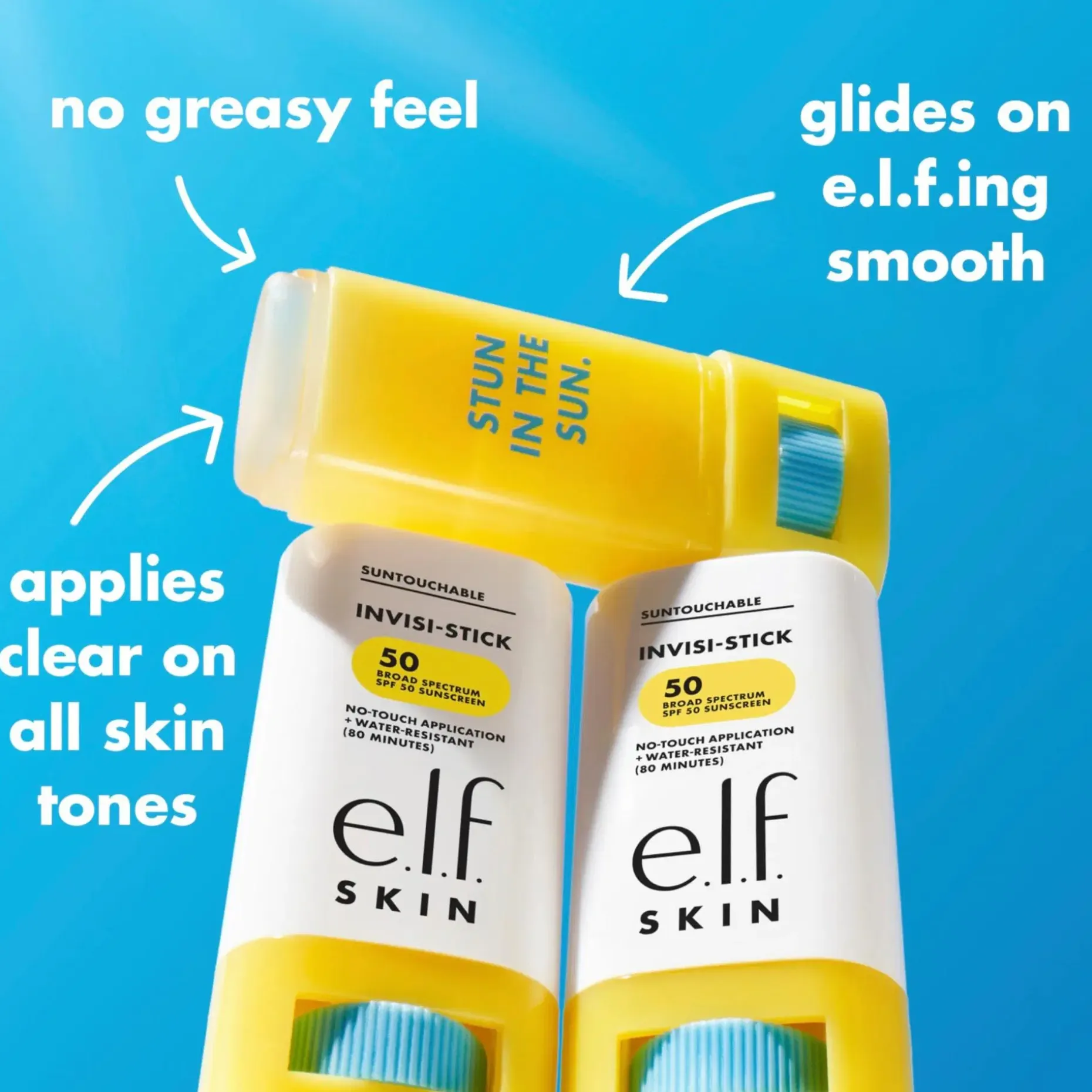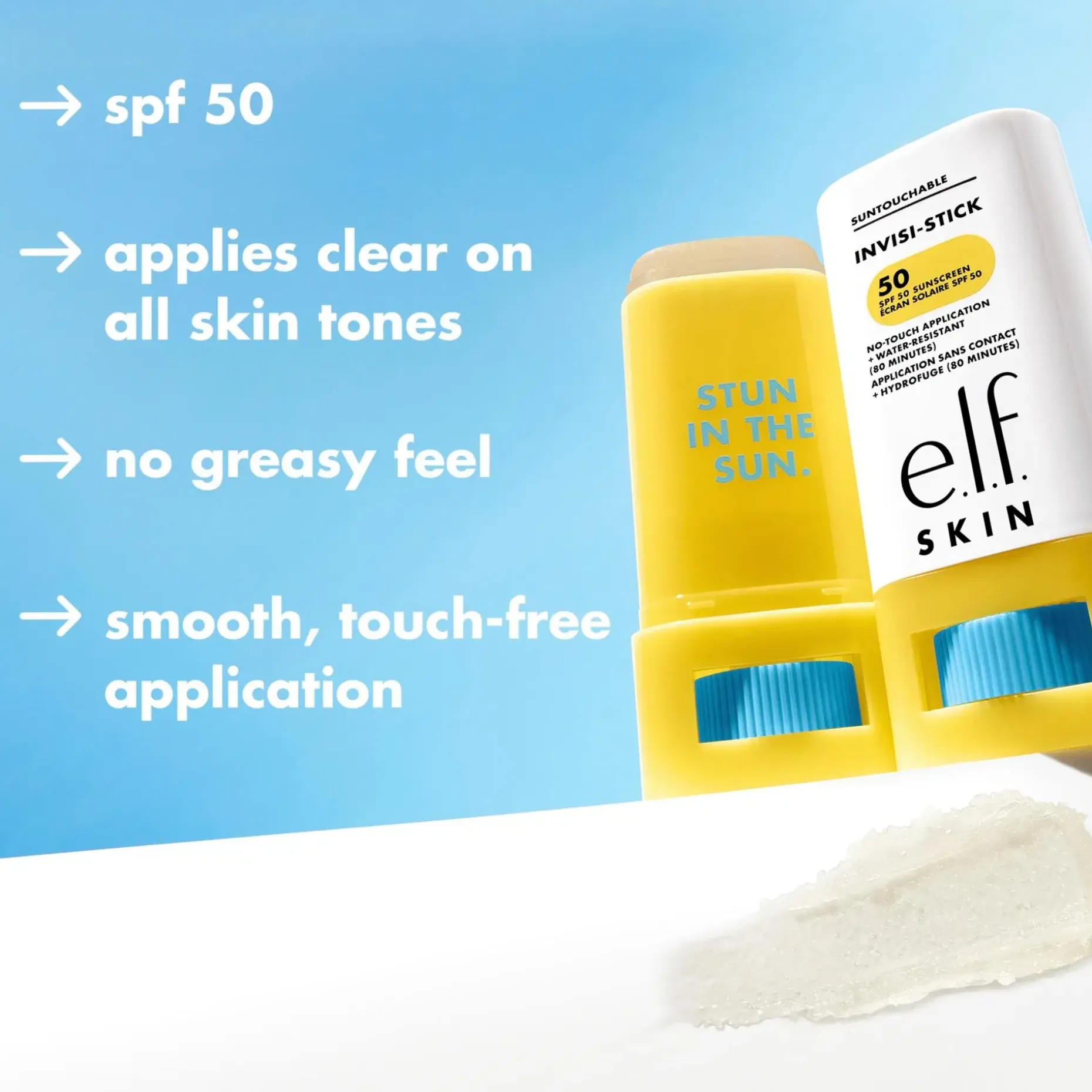 e.l.f. Cosmetics Suntouchable Invisi-Stick SPF 50 on aurinkovoide, jota haluat käyttää jatkuvasti! Tämä kätevä aurinkotikku tarjoaa UVA- ja UVB-aurinkosuojaa SPF 50 kevyellä koostumuksella, joka levittyy täysin läpinäkyvästi kaikille ihonsävyille ja antaa luonnollisen lopputuloksen (ei valkoisia laikkuja!). Se sisältää myös kosteuttavaa auringonkukansiemenöljyä ja rauhoittavaa bisabololia. Koska se ei ole rasvainen, voit levittää sitä uudelleen meikin päälle ja alle koko päivän ajan.