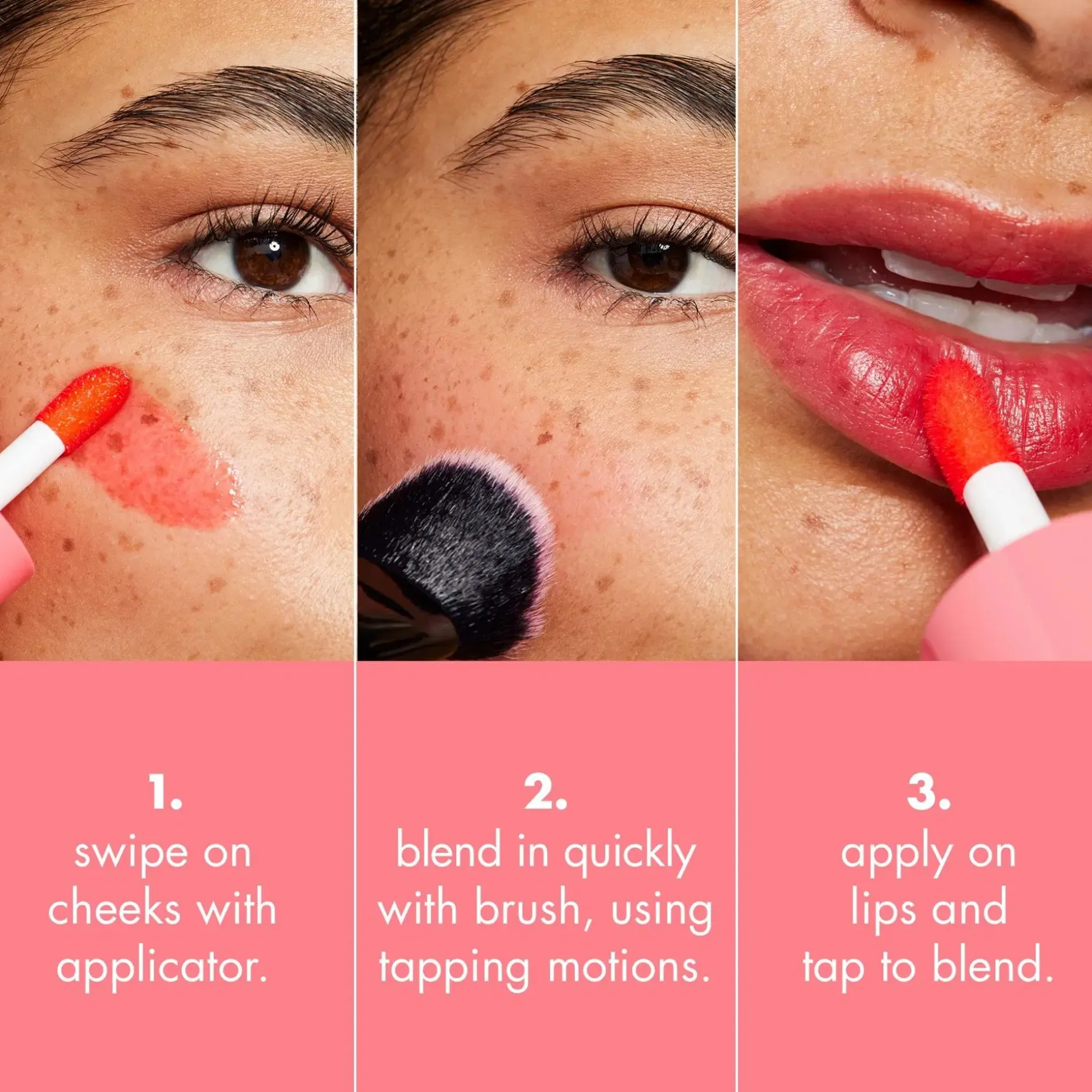 Pyyhkäise poskille applikaattorilla. Häivytä taputtelevalla liikkeellä Stain & Tint Blending Brush -siveltimellä. Lisää toinen kerros tuotetta lisätäksesi intensiteettiä. Levitä huulille ja taputtele häivyttääksesi värin tasaiseksi.
