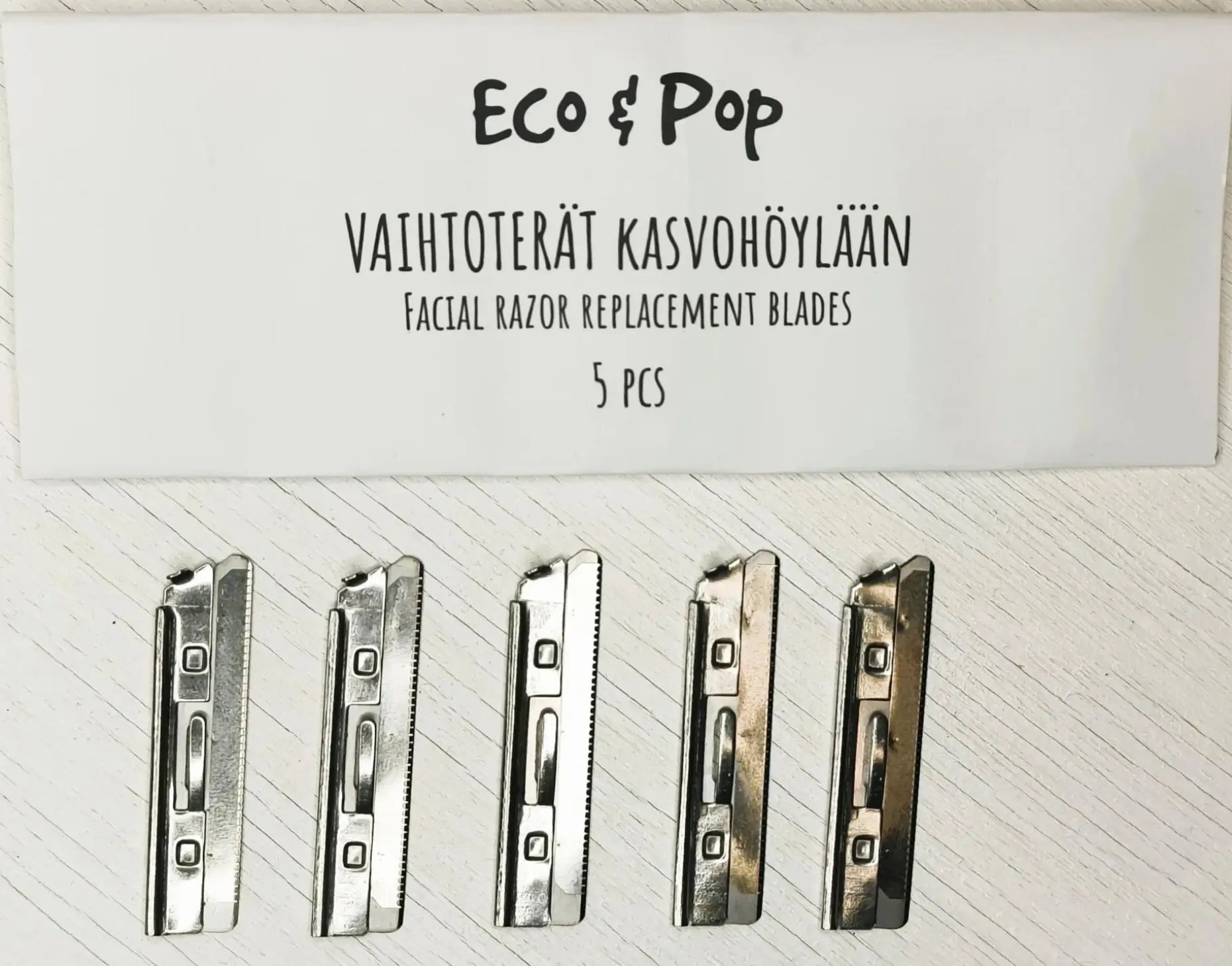 5 kpl vaihtoteriä metalliseen Eco & Pop kasvo- ja ihokarvahöylään. Laadukasta ruotsalaista ruostumatonta terästä. Terät voi kierrättää metallinkierrätyksessä. Käsittele teriä varovasti. Säilytä teriä aina lasten ulottumattomissa.