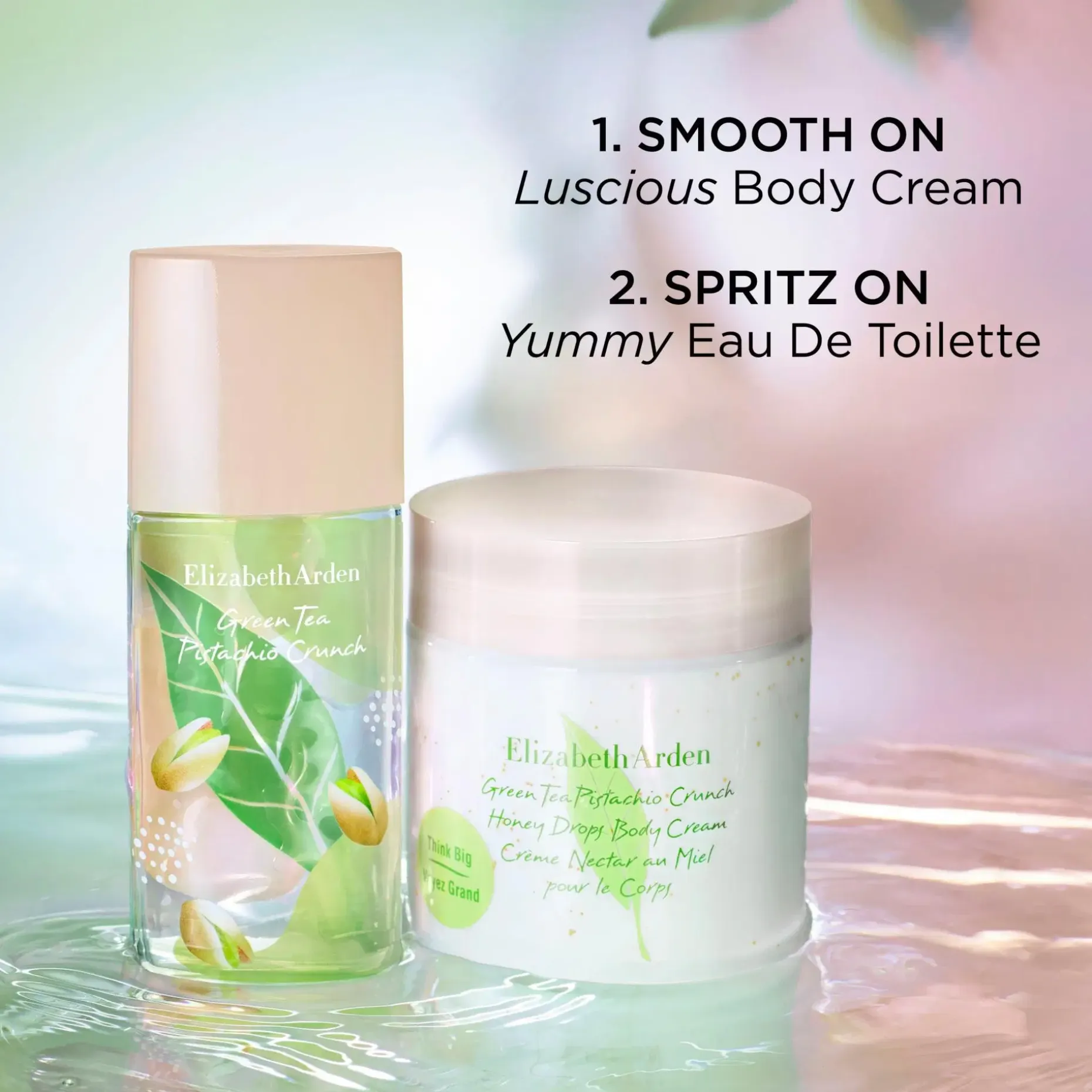 Herätä aistisi Elizabeth Ardenin UUDELLA Green Tea Pistachio Crunch Eau de Toilette -tuoksulla, joka on suolainen gourmand-tuoksu, jota piristävät helmeilevät sitrushedelmät ja pehmeät kukkaistutukset, jotka on kääritty rikkaaseen, lämpimään makeuteen. Tämä herkullinen, leikkisä tuoksu ilahduttaa pistaasinkuorisävyjen, italialaisen bergamottiöljyn, vihreän teen, heliotroopin, magnolian, Madagaskarin vaniljapavun, valkoisen meripihkan ja ruskean sokerin sävyillä.
