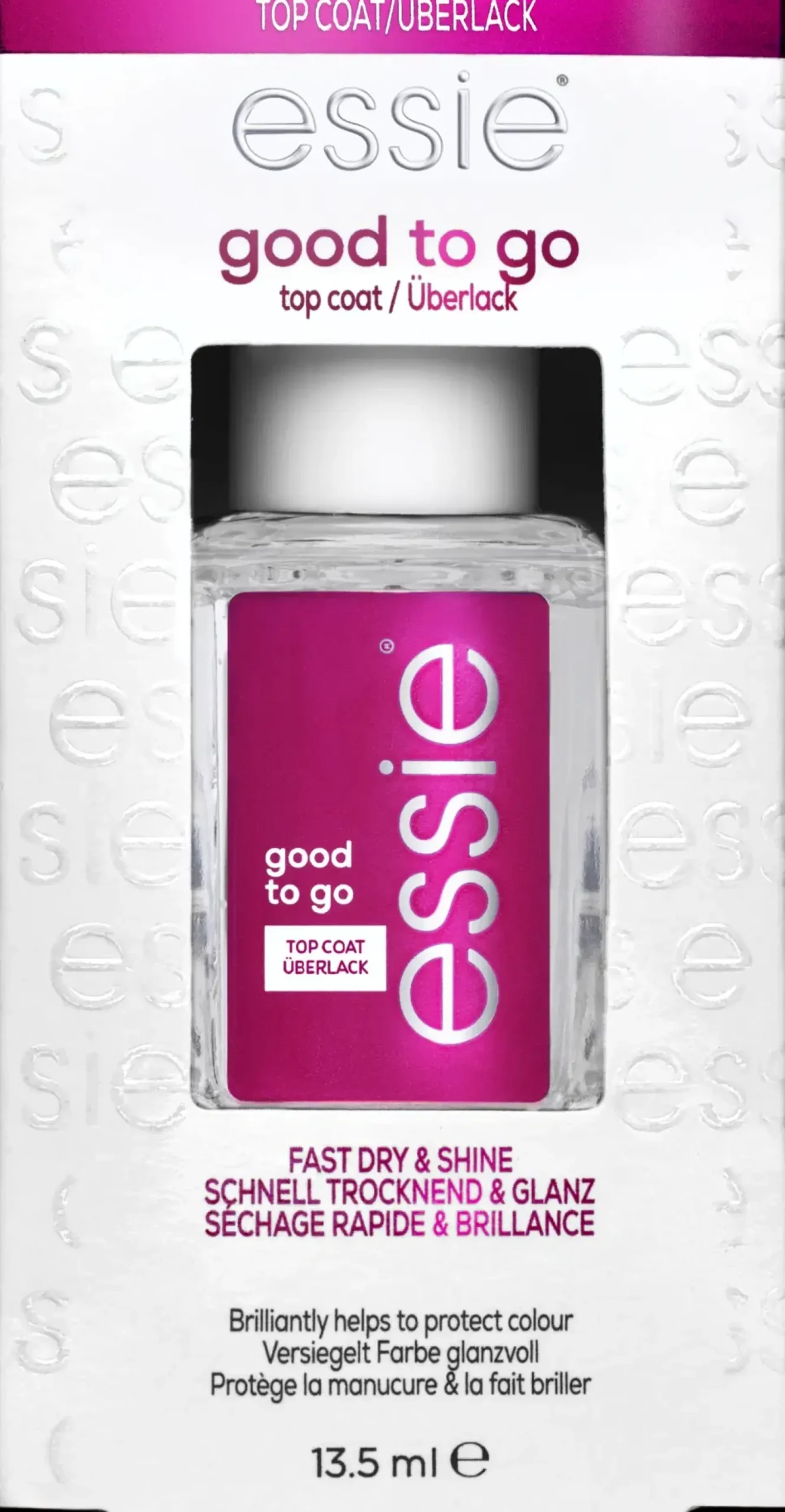 Nopeasti kuivuva ’Good To Go’ top coat -päällyslakkaa antaa sinulle täydellisesti lakatut kynnet ilman, että sinun tarvitsee odottaa lakan kuivumista. Päällyslakan nopeasti kuivuva koostumus sinetöi kynsilakan ja antaa sille kiiltävän pinnan. KÄYTTÖ: Levitä kerros Essie base coat -aluslakkaa, kaksi kerrosta Essie kynsilakkaa ja sivele lopuksi kerros Essie Good To Go top coat -päällyslakkaa. Sivele tarpeen vaatiessa lisää antamaan kiiltoa.