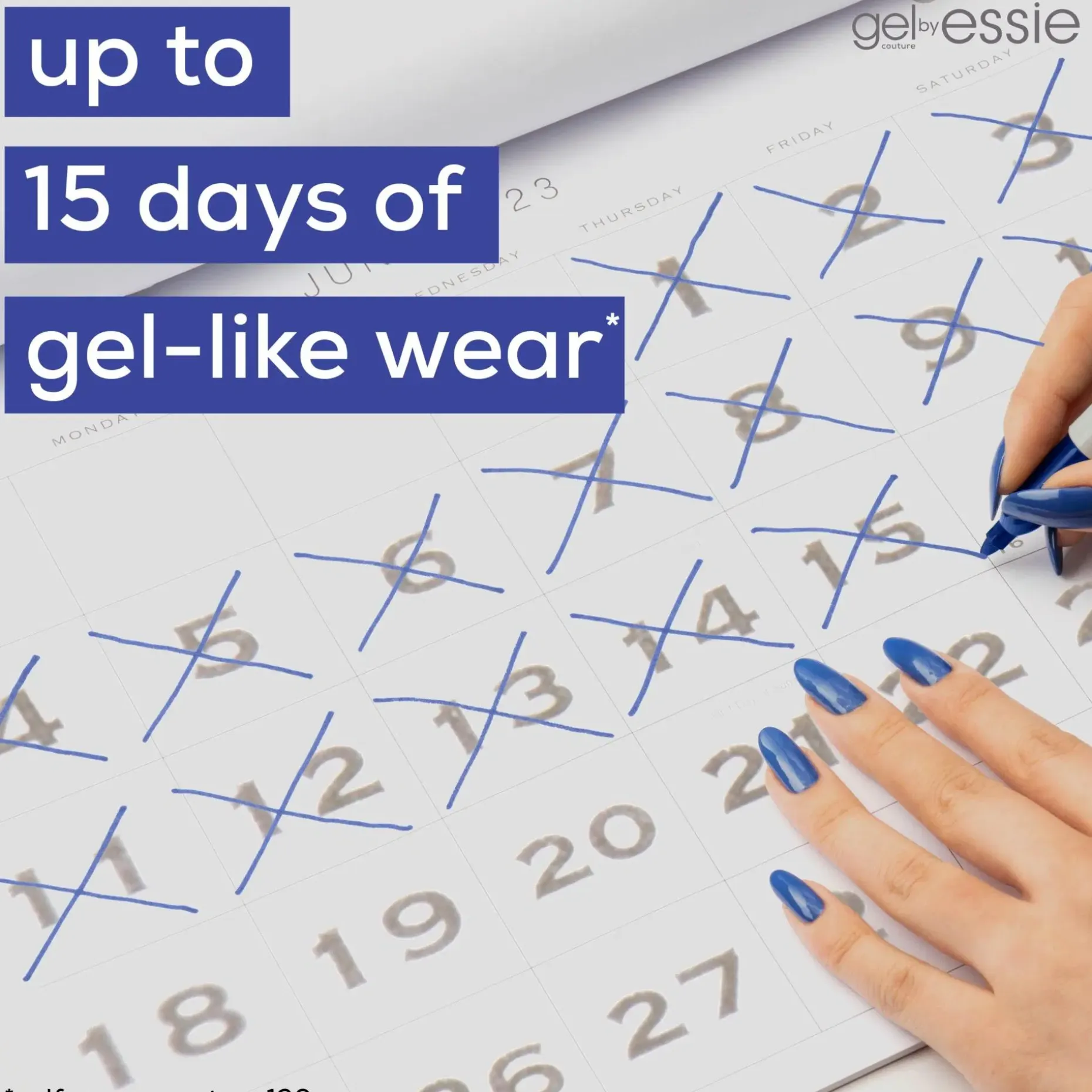 *Itsearviointi, 120 henkilöä, käytettäessä essie high shine gel couture -päällyslakkaa uudestaan 7 päivää lakkauksen jälkeen.