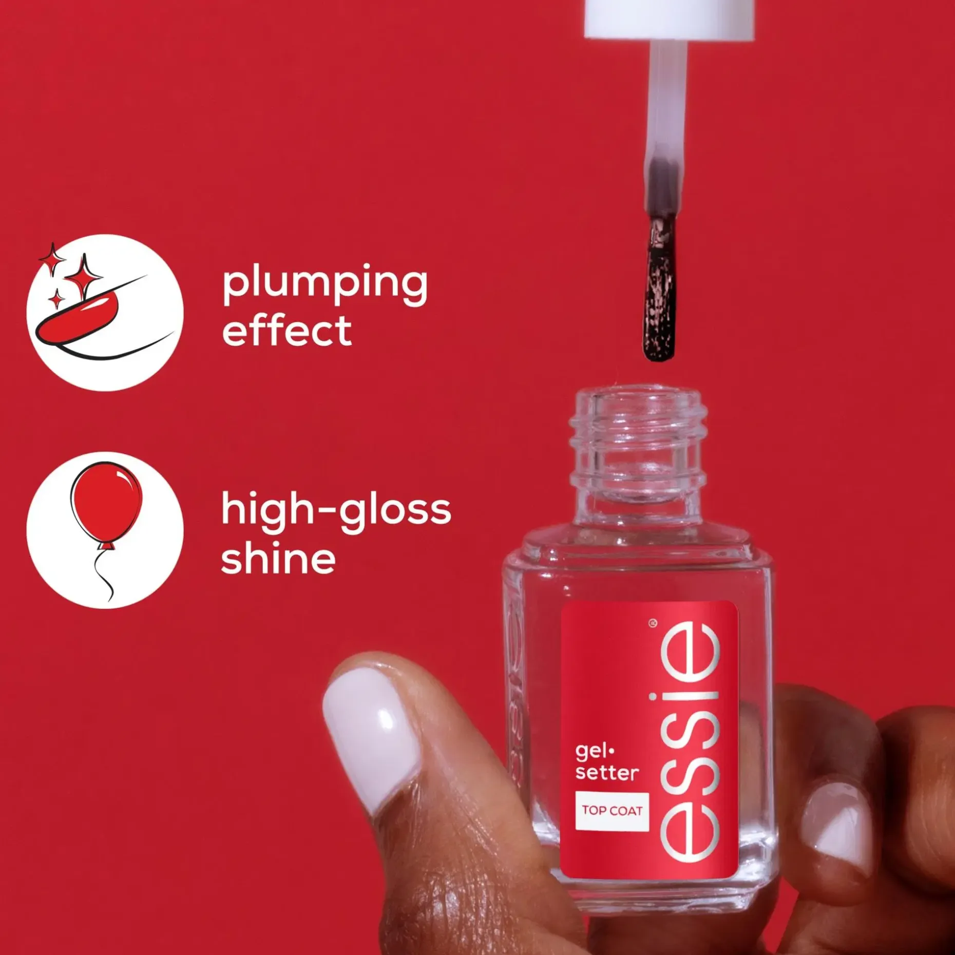 – Essie ’Gel Setter’ top coat -päällyslakka antaa kynsillesi runsaasti kiiltoa ja pidentää kynsilakan kestoa. Kiiltävä koostumus sinetöi värilakan ja antaa sille geelimäisen, pitkäkestoisen ja kiiltävän pinnan. Lopputulos: Kaunis, huoliteltu ja täyteläinen geelipintainen manikyyri. KÄYTTÖ: Levitä kerros Essie base coat -aluslakkaa, kaksi kerrosta Essie kynsilakkaa ja sivele lopuksi kerros Essie Gel Setter top coat -päällyslakkaa.