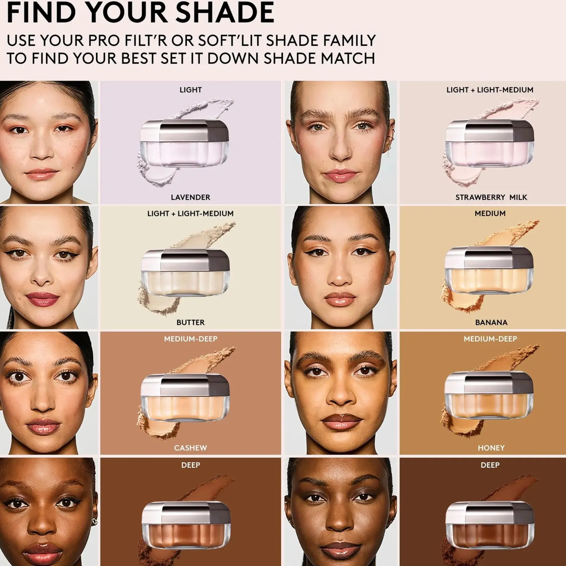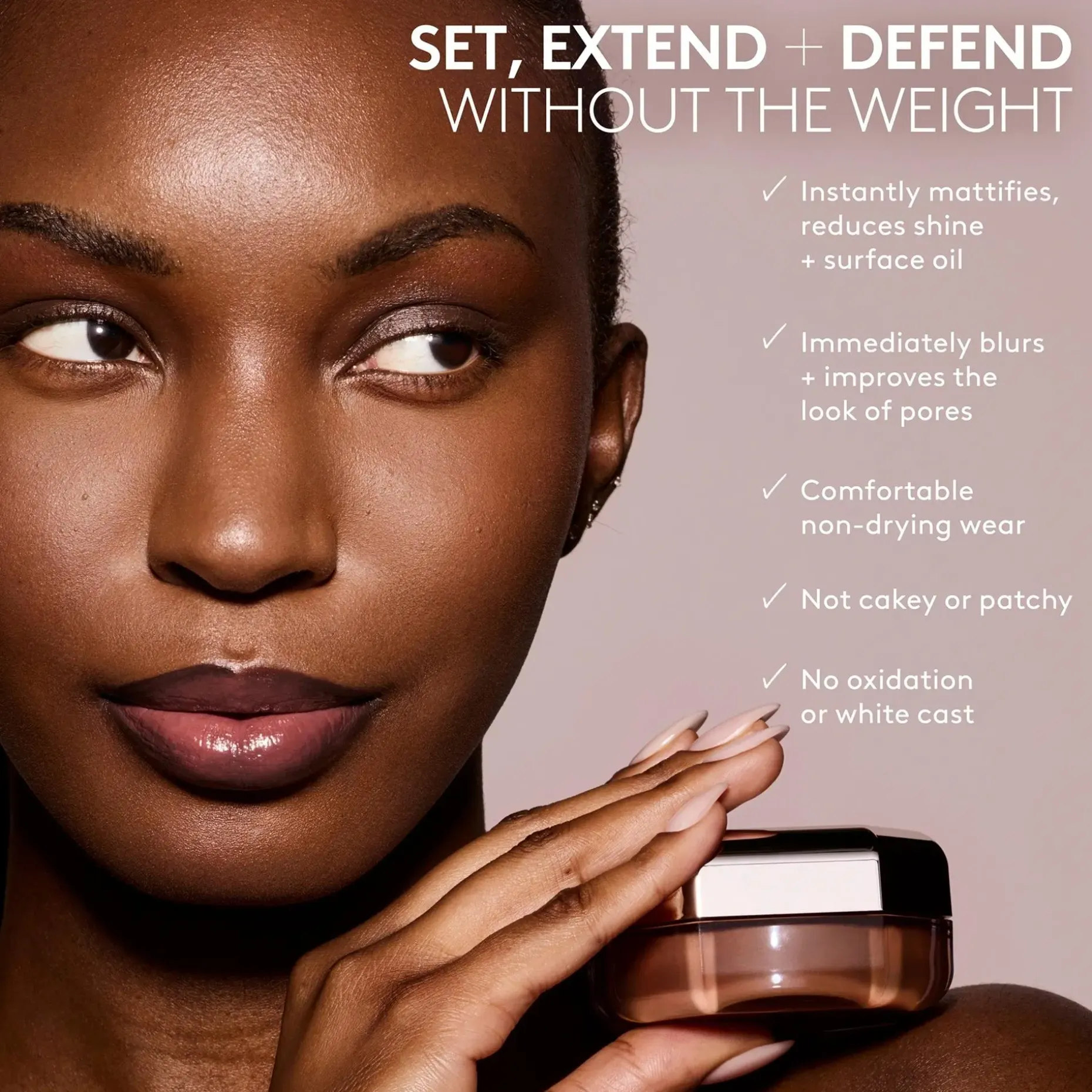 Levitä höyhenenkevyt kiinnityspuuteri, joka pidentää meikin kestoa, suojaa hieltä ja kosteudelta sekä hillitsee kiiltoa samalla kun se häivyttää ihohuokosten näkyvyyttä.