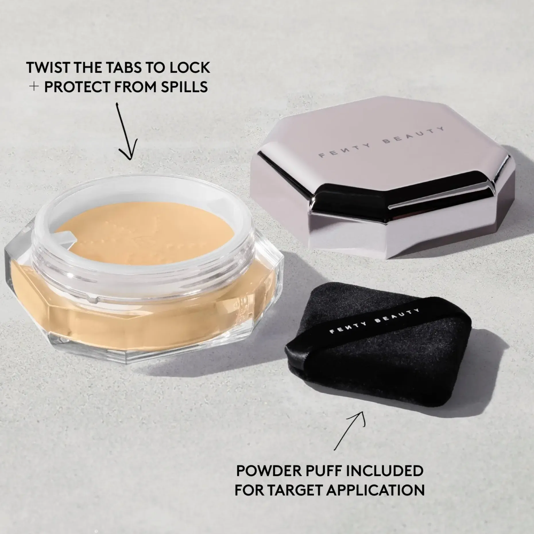 Koko kasvoille: pyörittele Powder Puff Setting Brush 170 -sivellintä (myydään erikseen) puuterissa ja poista ylimääräinen. Pyyhkäise kevyesti kasvoille meikin kiinnittämiseksi.