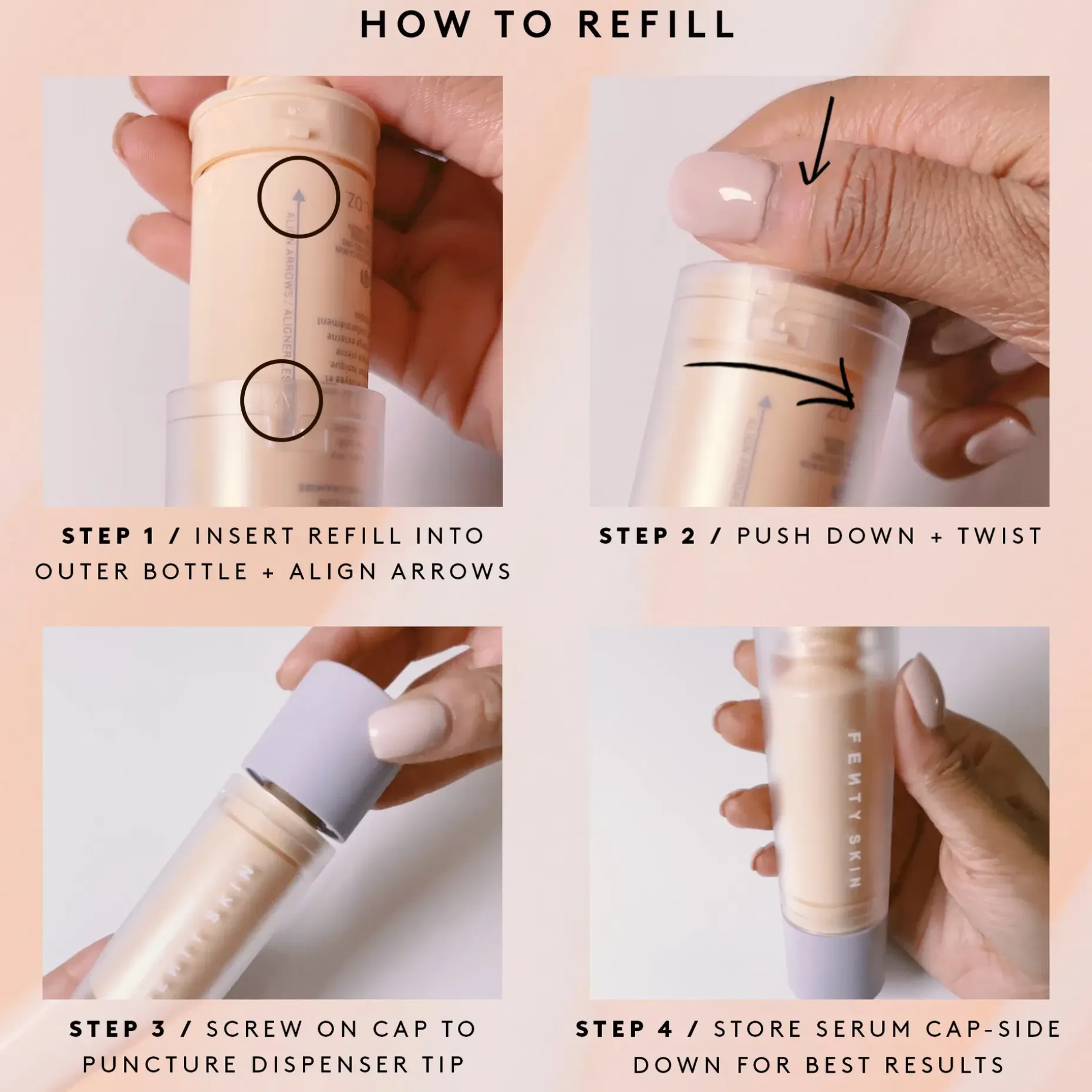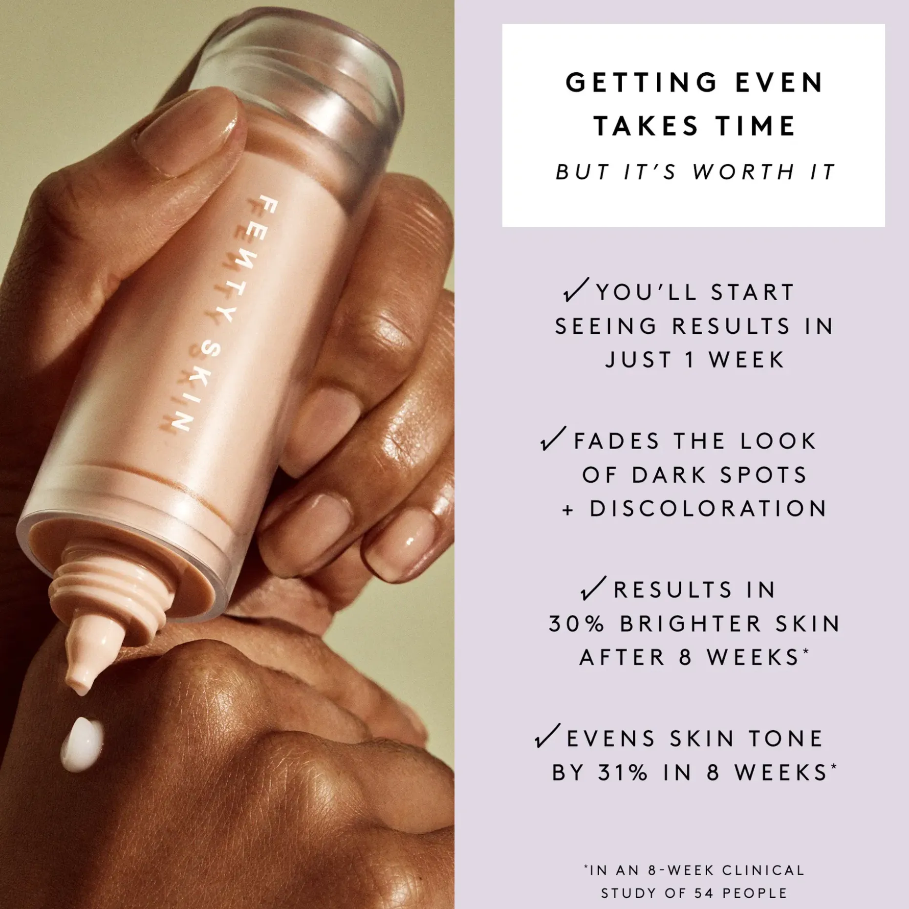 Täyttöpakkaus Fenty Skin Watch Ya Tone Niacinamide Dark Spot -seerumille. Ihonsävyä tasoittava ja kirkastava kasvoseerumi. Tehokas yhdistelmä niansiiniamidia, C-vitamiinia, lakritsinjuuriuutetta ja barbadoskirsikkaa edesauttaa näkyvästi tasaisempaa, kirkkaampaa ihoa. Häivyttää pigmenttimuutoksia ja värivirheitä jättäen ihon silkkisen pehmeäksi ja kauniin hehkuvaksi. Väriaineeton ja tuoksuton.