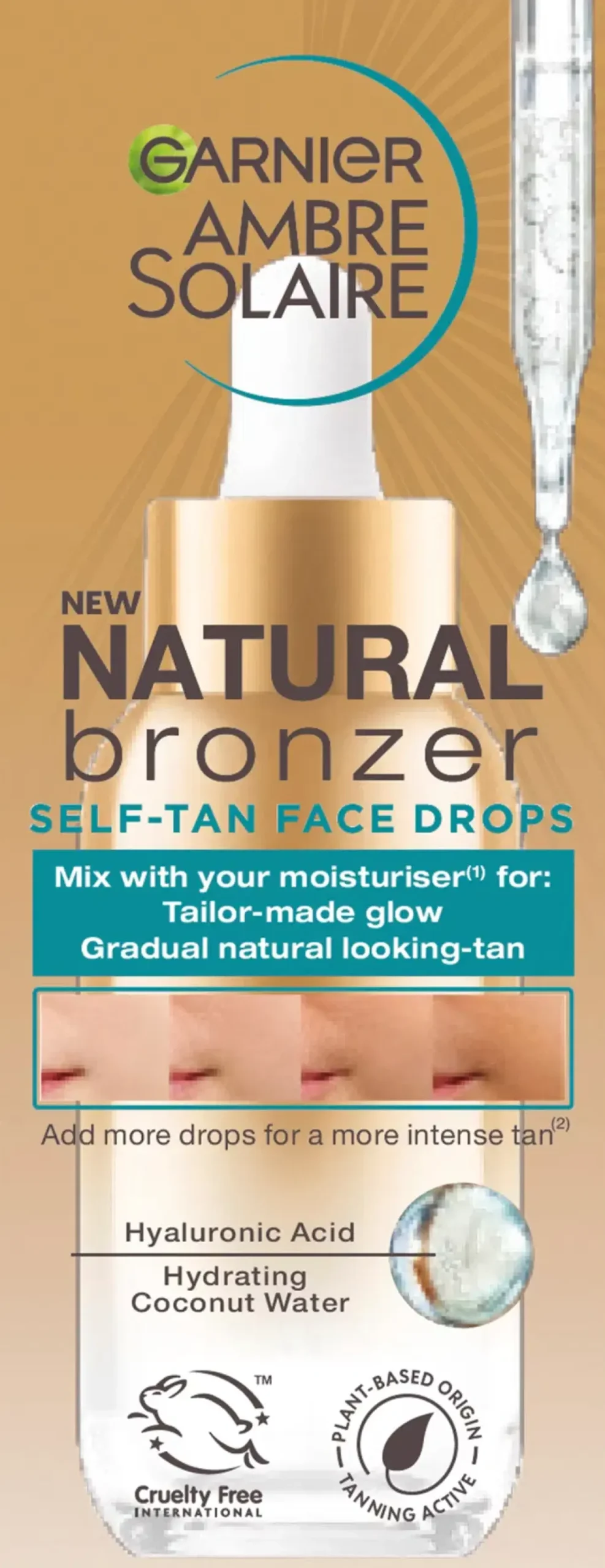 Helppo päivetys kasvoille koko vuoden ajan! Garnier Ambre Solaire Natural Bronzer Self Tan Face Drops itseruskettavat tipat kasvoille antavat iholle asteittain luonnolliselta näyttävän päivetyksen vain muutamalla tipalla. Koostumus sisältää hyaluronihappoa ja kosteuttavaa kookosvettä. Ihosi tuntuu välittömästi kosteutetulta ja pehmeämmältä ja saa asteittain päivettyneen sävyn ilman altistumista auringon säteille. Päivästä toiseen* iho saa kaunista auringonhehkua ja heleyttä, joka näyttää luonnolliselta. Koostumus sisältää kasviperäisiä vaikuttavia ainesosia ja on vegaaninen**. Natural Bronzer Self Tan Face Drops itseruskettavat tipat kasvoille on välttämätön lisä ihonhoitorutiiniisi.