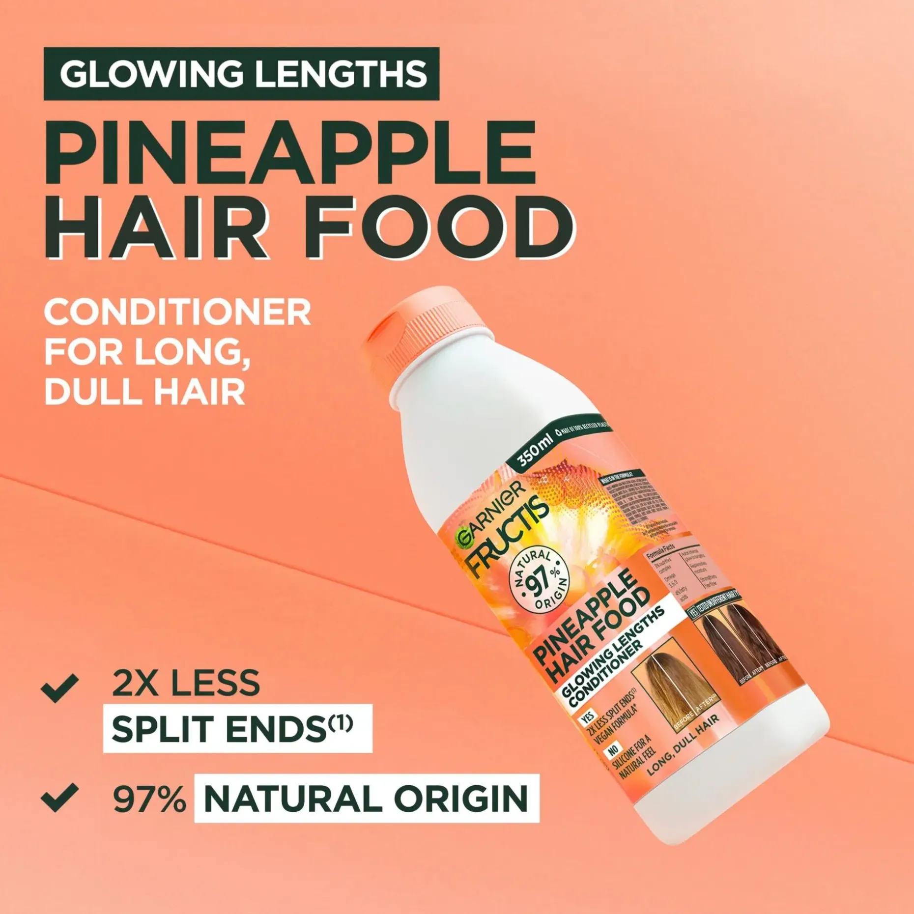 Intensiivistä kiiltoa ja ravitsevuutta pitkille hiuksille. Garnier Fructis Hair Food Pineapple -hoitoaine on kehitetty palauttamaan pitkien ja elottomilta näyttävien hiusten hehku. Koostumus ei sisällä silikonia luonnollisen tunteen aikaansaamiseksi ja se tekee hiuksista helpommin selvitettävät. Vegaaninen koostumus* on 97% luonnollista alkuperää ja 98% biohajoava**. 100% kierrätetystä muovista valmistettu muovipullo*** on myös kierrätettävä. Garnier on virallisesti hyväksytty Cruelty Free International Leaping Bunny -ohjelmaan.