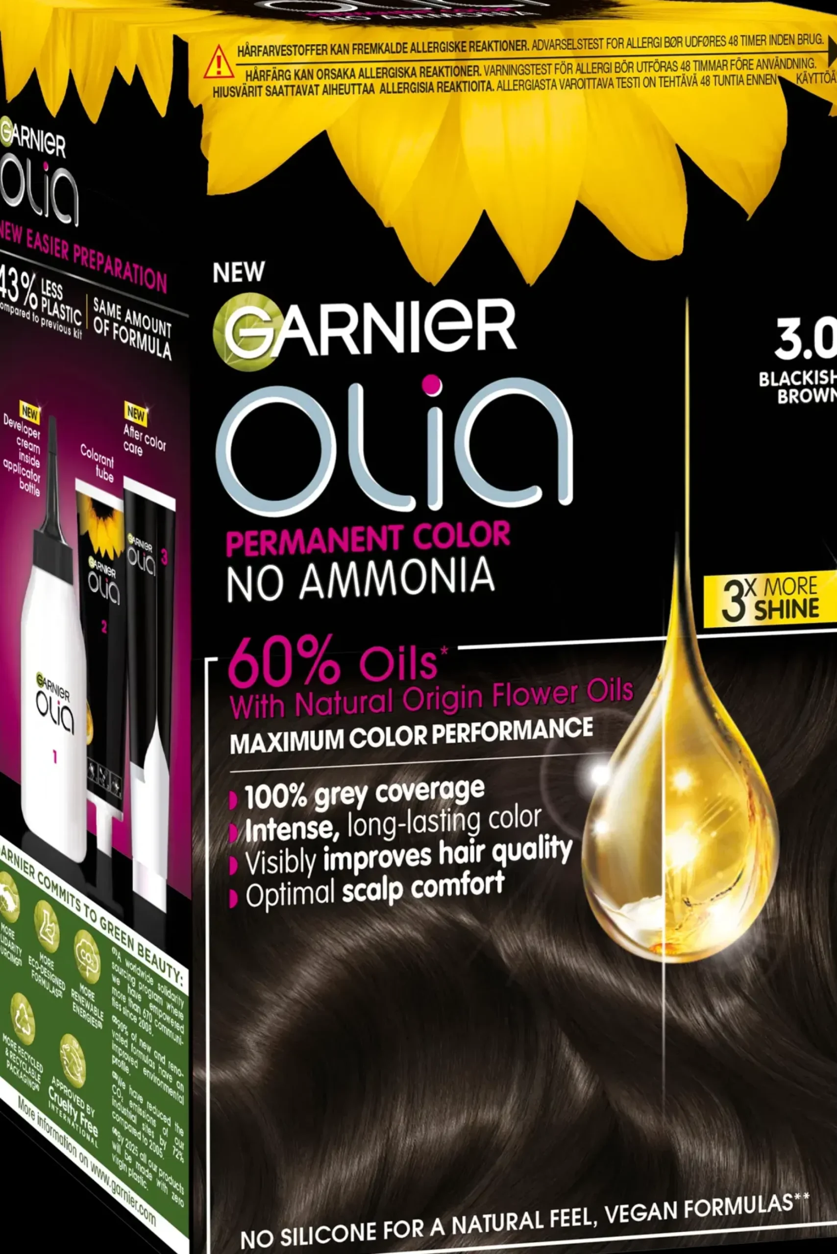 Garnier Olia 3.0 Soft Black, kestoväri ilman ammoniakkia, jonka koostumus sisältää 60% öljyjä*, antaa maksimaalisen värjäystuloksen ja tekee hiuslaadusta näkyvästi paremman. Olia 3.0 peittää harmaat hiukset jopa 100% ja on miellyttävä hiuspohjalle. 98% naisista ei havainnut näkyviä vaurioita** hiuksissaan. *Värivoiteessa **Kuluttajatutkimus, 262 naista, käytettäessä koko pakkaus.