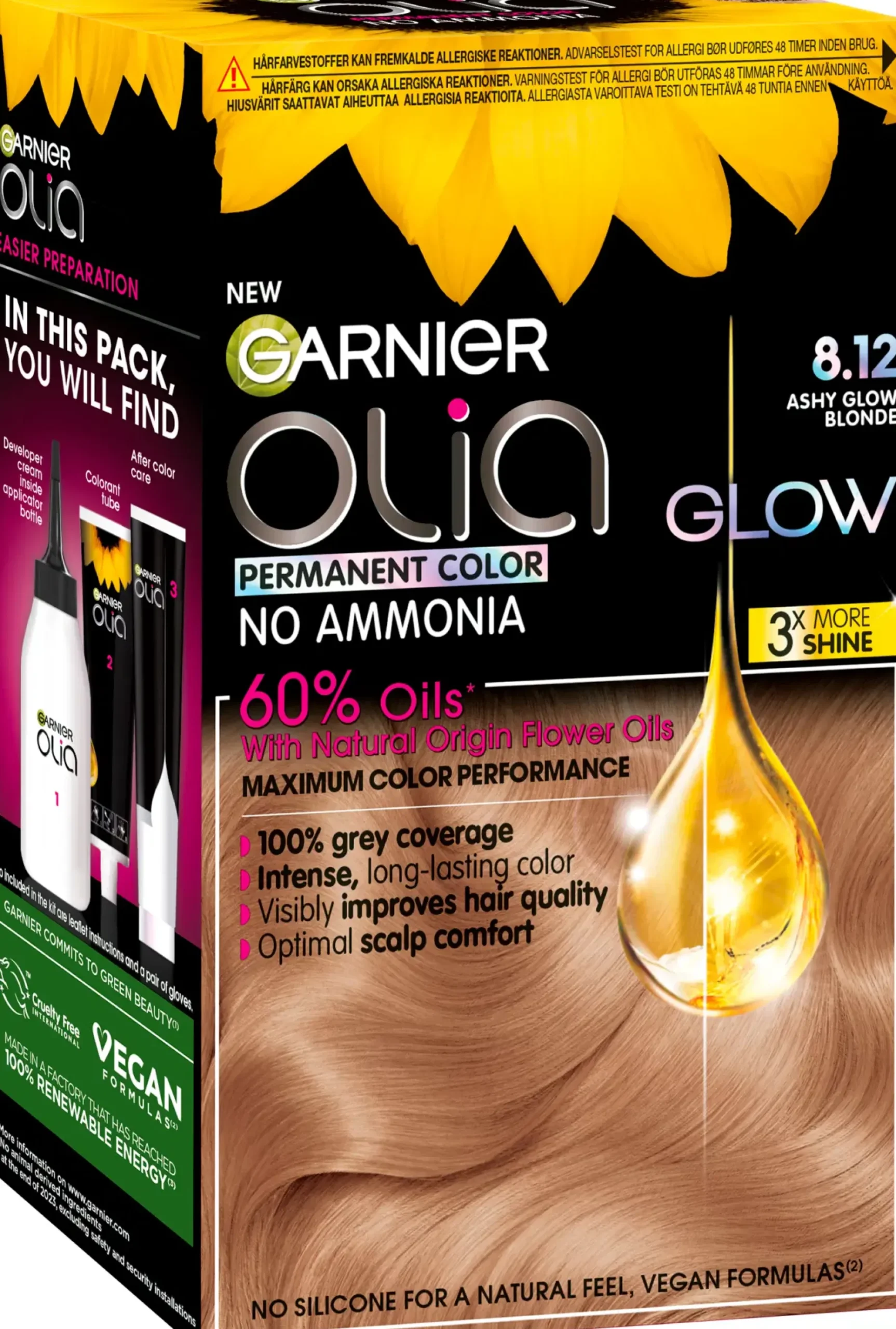 Garnier Olia 8.12 on kestoväri ilman ammoniakkia, joka antaa intensiivisen hiusvärin kylmillä vivahteilla ja upeaa kiiltoa. Koostumus sisältää 60% öljyjä* ja se peittää harmaat hiukset 100 %. Tuloksena kaunis. pitkäkestoinen hiusväri ja näkyvästi parempi hiuslaatu. Vegaaniset koostumukset* – Kestoväri – Ilman ammoniakkia – 100% harmaiden peitto – Intensiivinen, pitkäkestoinen hiusväri – Tekee hiuslaadusta näkyvästi paremman – Vegaaniset koostumukset* – Koostumus sisältää 60% öljyjä* – Pakkaus sisältää: 1 värivoide, 1 kehite, 1 hoitoaine, 1 käyttöohjeet, 1 pari suojakäsineitä *Värivoiteessa **Ei sisällä eläinperäisiä ainesosia