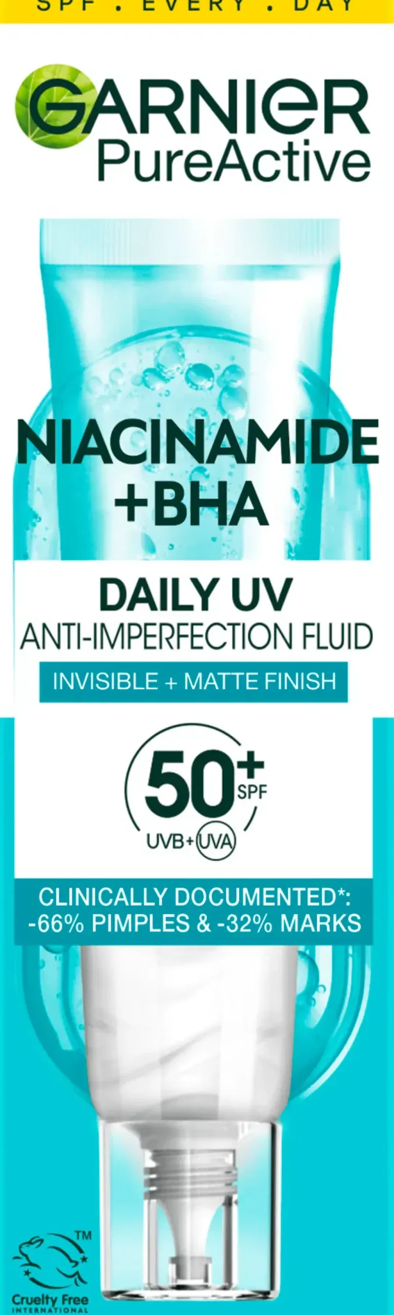 Garnier PureActive Salicylic Anti-Imperfection Daily UV Fluid koostumus kasvoille päivittäiseen käyttöön erittäin korkealla aurinkosuojalla. Kevyt, nestemäinen koostumus sisältää [SALISYYLIHAPPOA + NIASIINIAMIDIA] ja SPF50+, vähentämään epäpuhtauksia, ihohuokosten näkyvyyttä ja aknen jättämiä jälkiä sekä suojaamaan ihoasi UVB-, UVA- ja pitkiä UVA-säteitä vastaan. Hajusteeton koostumus on näkymätön kaikilla ihon sävyillä, ei tuki ihohuokosia, tuntuu kevyeltä iholla ja tekee siitä mattapintaisen koko päiväksi. DOKUMENTOIDUT TULOKSET: -66% epäpuhtauksia, -32% tummia läiskiä, -31% ihohuokosten näkyvyys* • Koostumus sisältää SALISYYLIHAPPOA + NIASIINIAMIDIA] ja SPF50+ • Taistelee epäpuhtauksia ja tummia läiskiä vastaan • Vähentää ihohuokosten ja aknen jättämien jälkien näkyvyyttä • Antaa suojaa UVB-, UVA- ja pitkiä UVA-säteitä vastaan • Hajusteeton • Näkymätön kaikille ihon sävyille * Kosmeettis-kliininen tutkimus, 34 henkilöä, 8 viikkoa