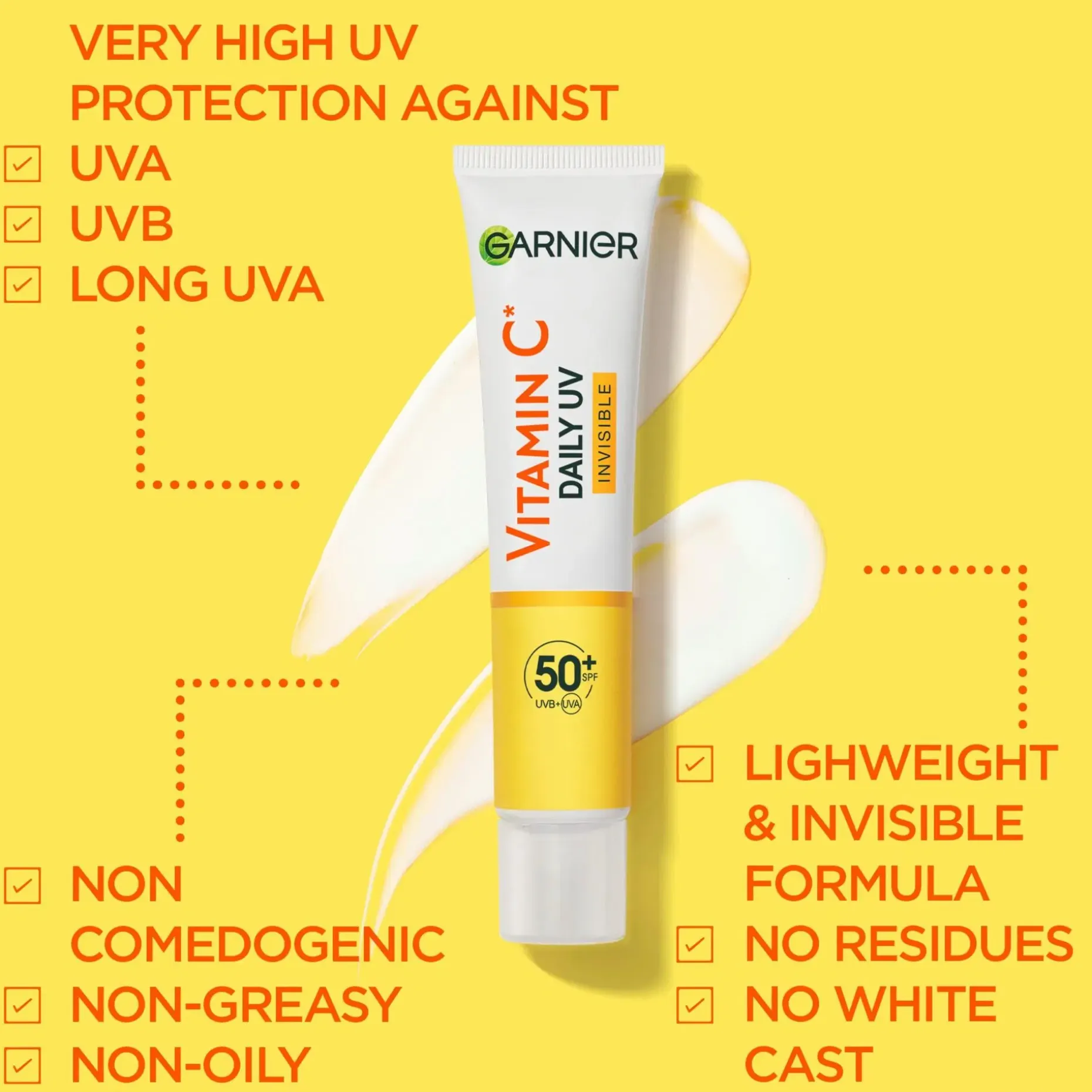 Vitamin C* Daily UV Fluid Invisible on koostumus kasvoille päivittäiseen käyttöön, erittäin korkealla aurinkosuojalla SPF50+. Kevyt, nestemäinen koostumus sisältää [C-VITAMIINIA*] +[PEPTIDEJÄ] + [HYALURONIHAPPOA] kosteuttamaan ihoa koko päivän samalla kun se antaa suojaa UVB-, UVA- ja pitkiä UVA-säteitä vastaan ja auttaa tummien läiskien muodostumista vastaan. Ei jätä iholle tahmaista tai rasvaista tunnetta. 12 viikon jälkeen**: 53 % vähemmän tummia läiskiä, 43 % enemmän hehkua, 40 % tasaisempi iho. Koostumus ei tuki ihohuokosia, sopii herkälle iholle. Testattu ihotautilääkärin ja silmälääkärin valvonnassa. Näkymätön lopputulos kaikilla ihotyypeillä ja ihon sävyillä. • Koostumus sisältää [C-VITAMIINIA*] + [PEPTIDEJÄ] + [HYALURONIHAPPOA] • Taistelee kaikenlaisia tummia läiskiä vastaan • 53% vähemmän tummia läiskiä, 43% enemmän hehkua, 40% tasaisempi iho** • Ei tuki ihohuokosia • Sopii herkälle iholle • Testattu ihotautilääkärin ja silmälääkärin valvonnassa • Näkymätön lopputulos kaikilla ihotyypeillä ja ihon sävyillä *C-vitamiini = C-vitamiinin johdannainen **Kosmeettis-kliininen tutkimus, 76 henkilöä, 12 viikkoa, vaikutus tummen läiskien intensiteettiin ja näkyvyyteen. Keskiarvo, tulokset voivat vaihdella.