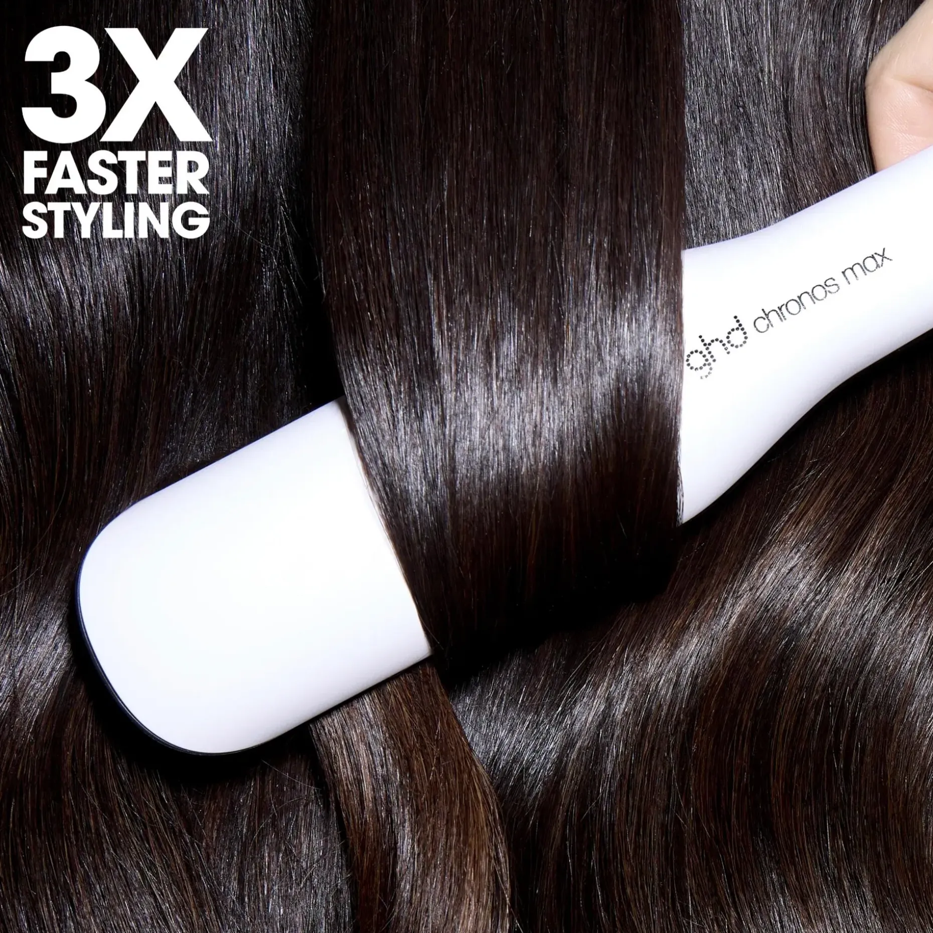 TÄYDELLINEN PITKILLE, PAKSUILLE JA KIHAROILLE HIUKSILLE – ghd Chronos nyt Max-versiona 85 % suuremmalla harjasosalla verrattuna ghd goldiin, mikä tekee siitä täydellisen muotoiluraudan.