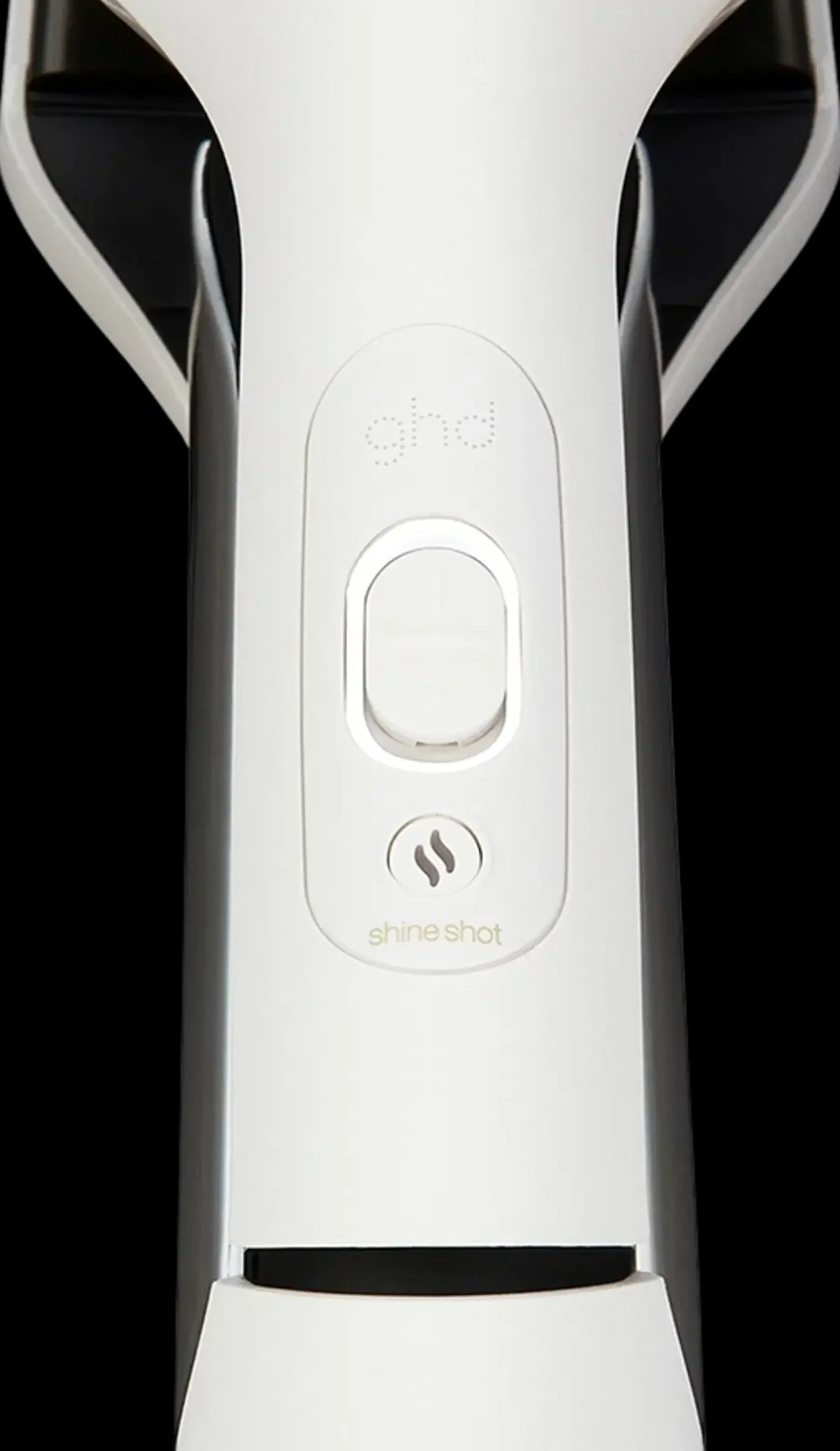 5. Kun hiukset ovat täysin kuivat, aktivoi Shine Shot™ painamalla Shine Shot™ -painiketta 3 sekunnin ajan, kunnes kuulet piippauksen. Puhallin pysähtyy ja levyn lämpötila nousee ihanteelliseen 185 °C:n ghd-muotoilulämpötilaan. Kun laite piippaa ja valot lakkaavat vilkkumasta, Shine Shot™ on valmis