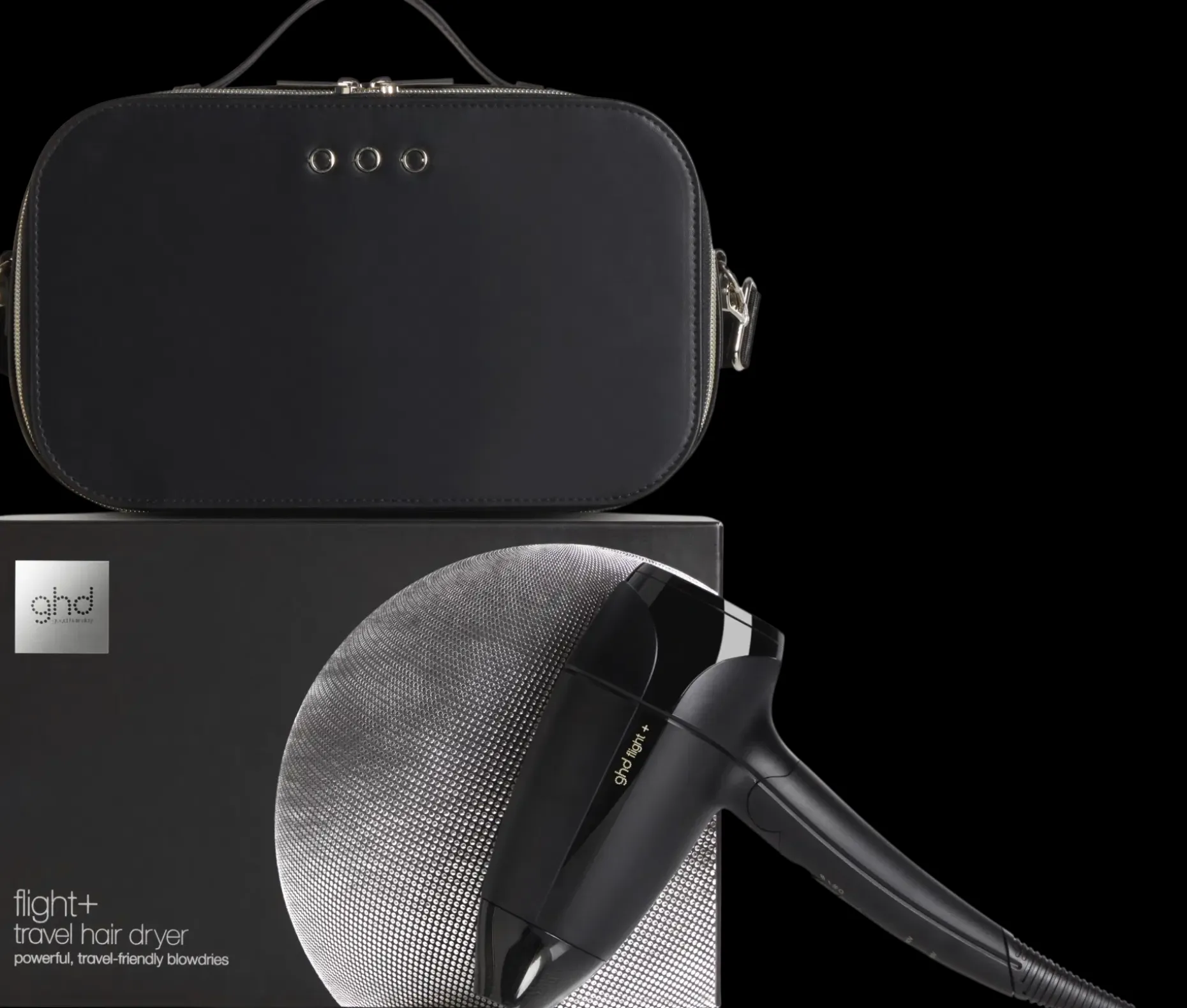 ghd flight+ -hiustenkuivaajan mukana tulee ylellinen säilytyslaukku, joka suojaa kuivaajaa matkoilla.