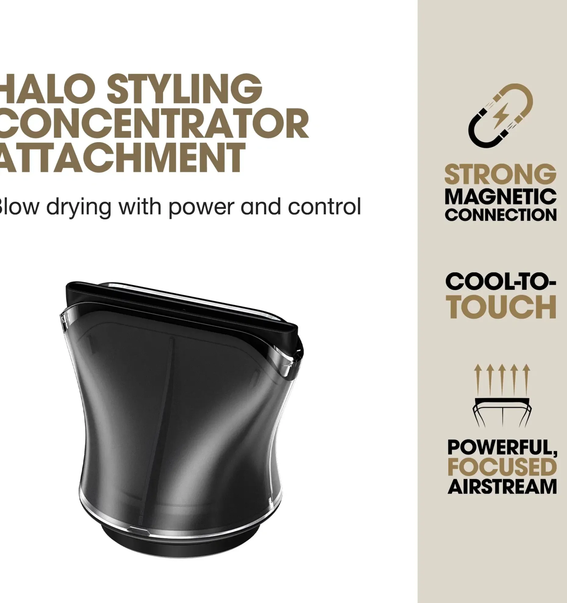 Vahvalla magneettikiinnityksellä keskityssuutin lukittuu paikalleen sekunneissa – ei säätämistä, ei keskeytyksiä. Se mukautuu helposti. ghd halo™ -muotoilukonsentraattori on salainen aseesi virheettömiin, salonkitason föönauksiin joka kerta.
