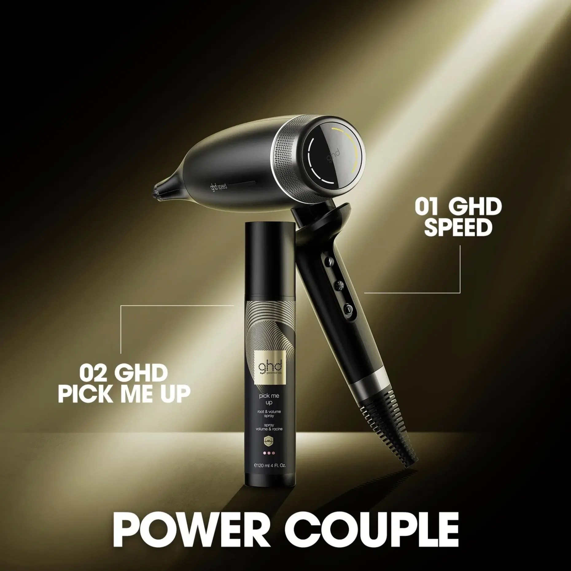 Koe uuden aikakauden föönaus ennennäkemättömän nopealla ghd speed ionic -hiustenkuivaajalla (musta). Siinä on mullistava ghd haloTM -kaksoisilmavirtausteknologia. Tehokkuus ja hallinta yhdistyvät viileän päänahan ja viileän kosketuksen ominaisuuksiin – ilman lämpövaurioita¹.