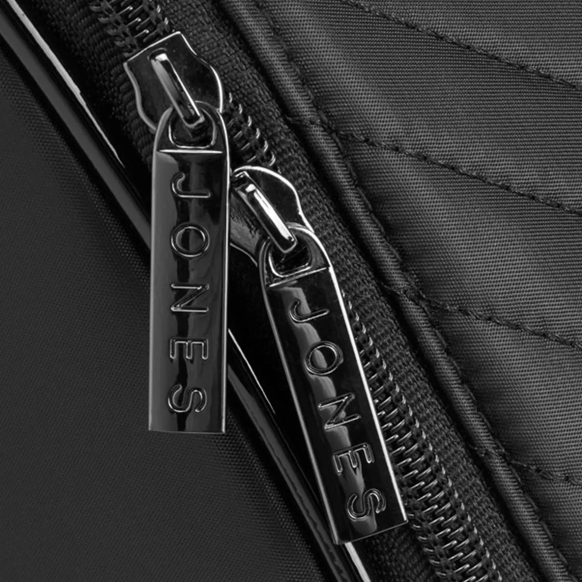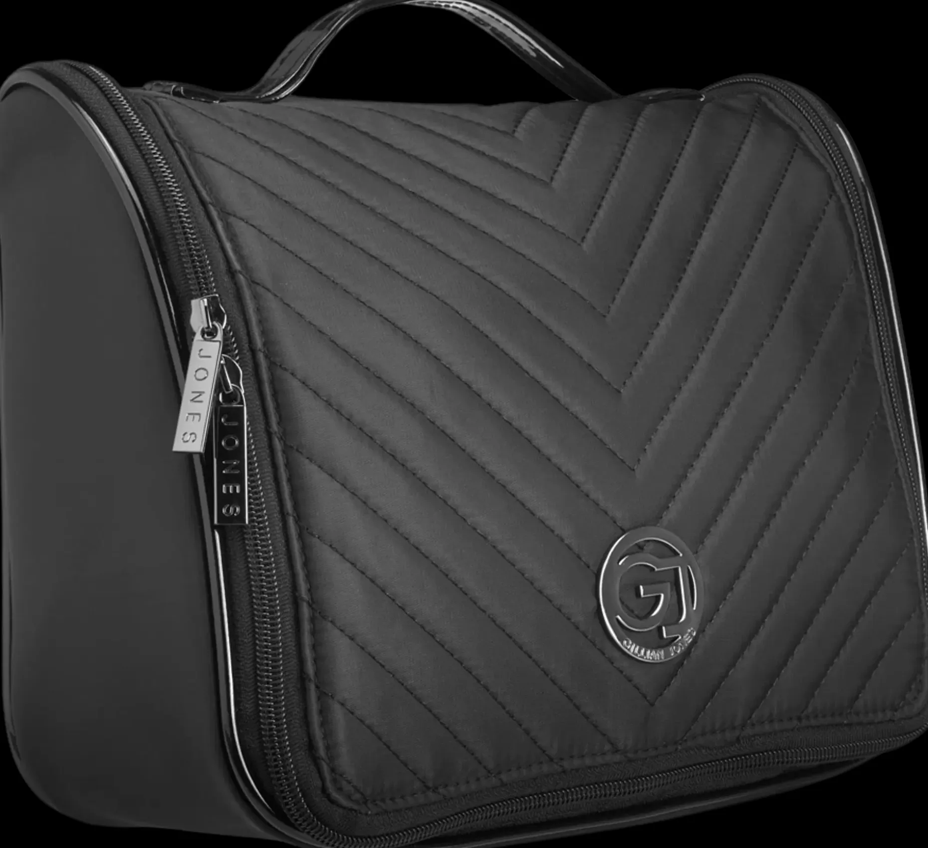 Gillian Jones Organizer kosmetiikkalaukku ripustuslenkillä, laukussa on musta kankainen pinta kauniilla GJ-tunnuksella edessä. Upeassa kosmetiikkalaukussa on kolme vetoketjullista sisätaskua ja neljä avointa lokeroa kauneustuotteidesi järjestämiseen. Lisäksi kosmetiikkalaukussa on IATA:n vaatimukset täyttävä ”check in”-pussukka lennolle, joka on valmistettu PVC-vapaasta muovista. Ripustuslenkin avulla kosmetiikkalaukku voidaan ripustaa kylpyhuoneen naulakkoon. Vuoren nylon on valmistettu kierrätetyistä muovipulloista. Materiaali on nimeltään RPET.