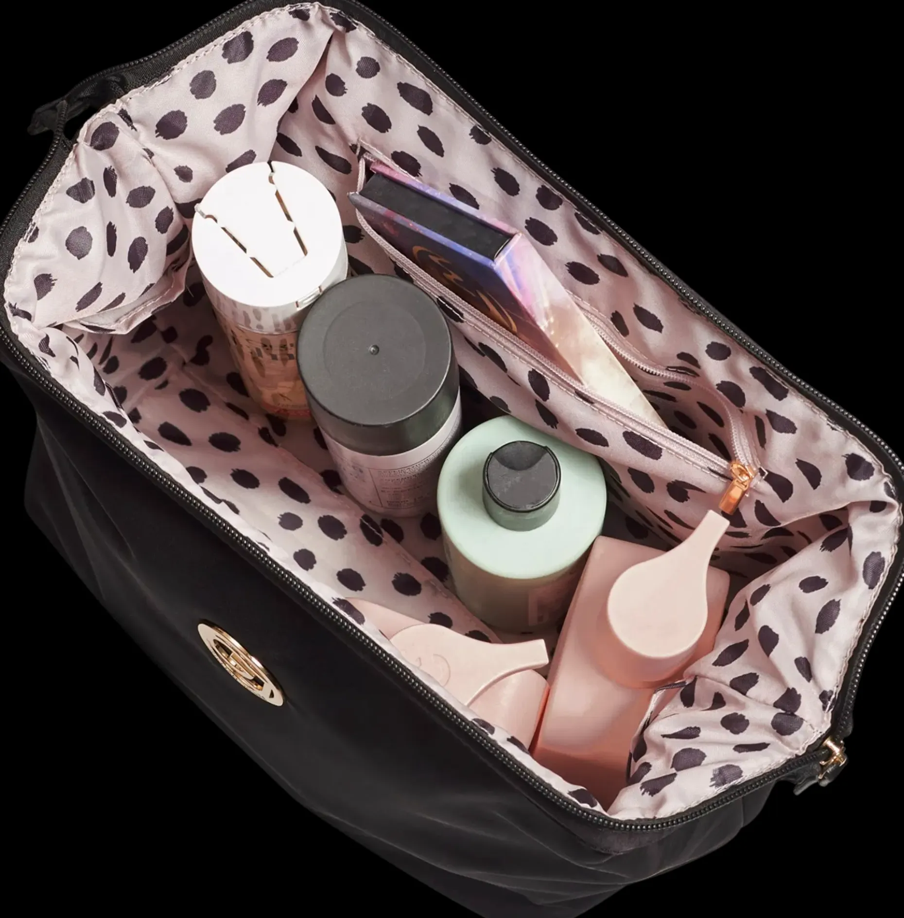 Laukku on suuri ja tilava, joten siinä on runsaasti tilaa kaikille suosikkituotteillesi. Frame laukun avulla et enää koskaan tee kompromisseja mitkä tuotteet voit ottaa mukaasi matkallesi. Kahden suuren taskun ja keskellä olevan ison vetoketjullisen taskun avulla voit helposti järjestellä tuotteet ja löytää ne uudelleen, kun tarvitset niitä. Laukun ripustoiminto varmistaa, että pussi ei putoa auki ollessaan ja antaa sinulle hyvän yleiskuvan kaikista tuotteistasi.