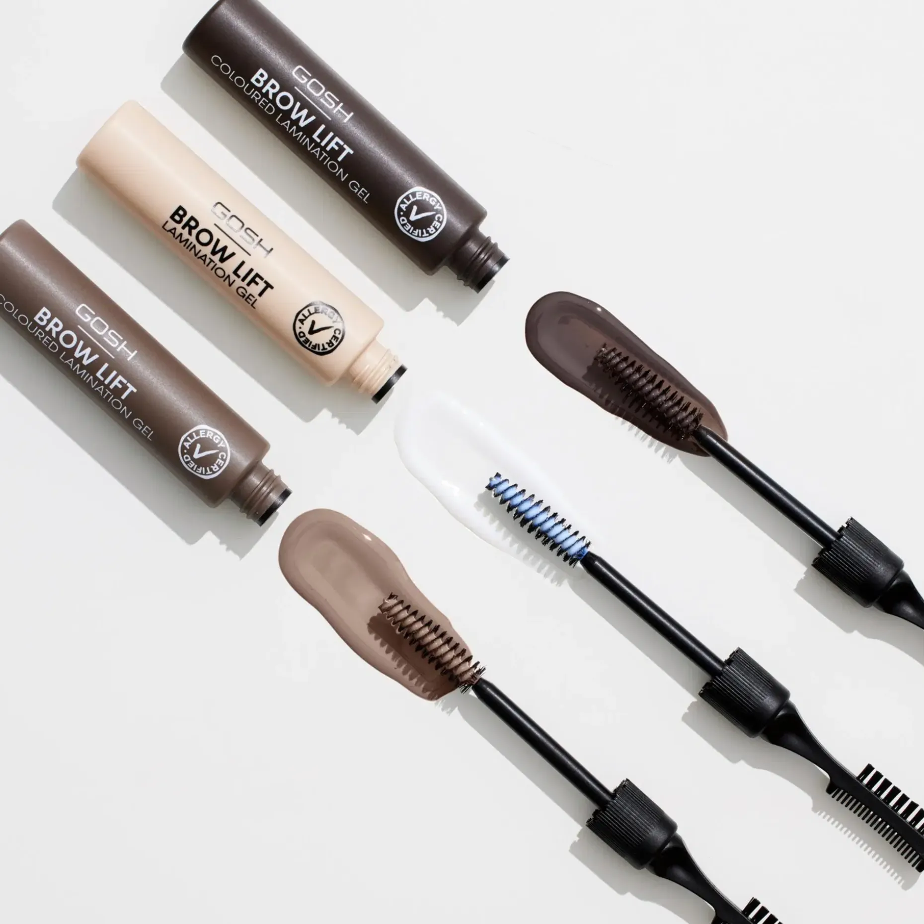 GOSH Brow Lift Lamination Gel -kulmageeli on nopea ja helppo vaihtoehto kulmien laminoinnille. Kulmien laminointigeeli ryhdistää ja kohottaa katsetta ja auttaa luomaan kulmille haluamasi muodon ja ryhdin. Geeli antaa kulmille tuuheutta ja täyteläisyyttä. Harjaosan avulla harjaat kulmakarvat haluamaasi muotoon. Pitkäkestoinen lopputulos pysyy hyvin kulmissa. Tuote on hajusteeton ja vegaaninen.