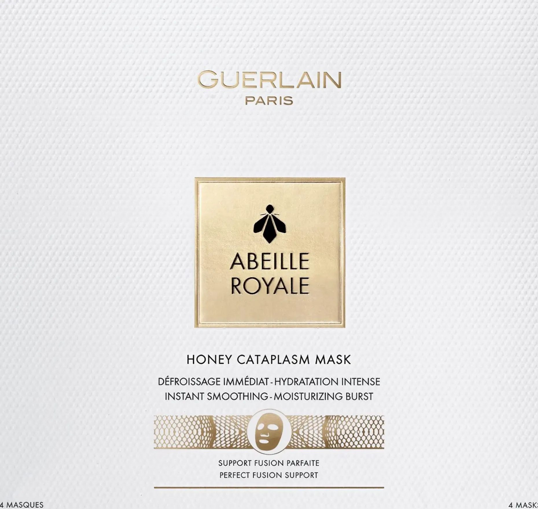 Guerlainin hunajainen Honey Cataplasm -kangasnaamio on Abeille Royale -linjan uusin lisäys. Naamio pysyy kasvoilla todella hyvin ja se muotoutuu kasvonpiirteiden mukaan. Ihosta tulee sileämpi*, rypyt ja juonteet tasoittuvat huomattavasti* ja iho näyttää virkeältä. Iho on kosteutettu, täyteläisempi ja hehkuvampi**. *Instrumentaalinen testi, 16 naista **Kliininen arviointi 32 naiselle