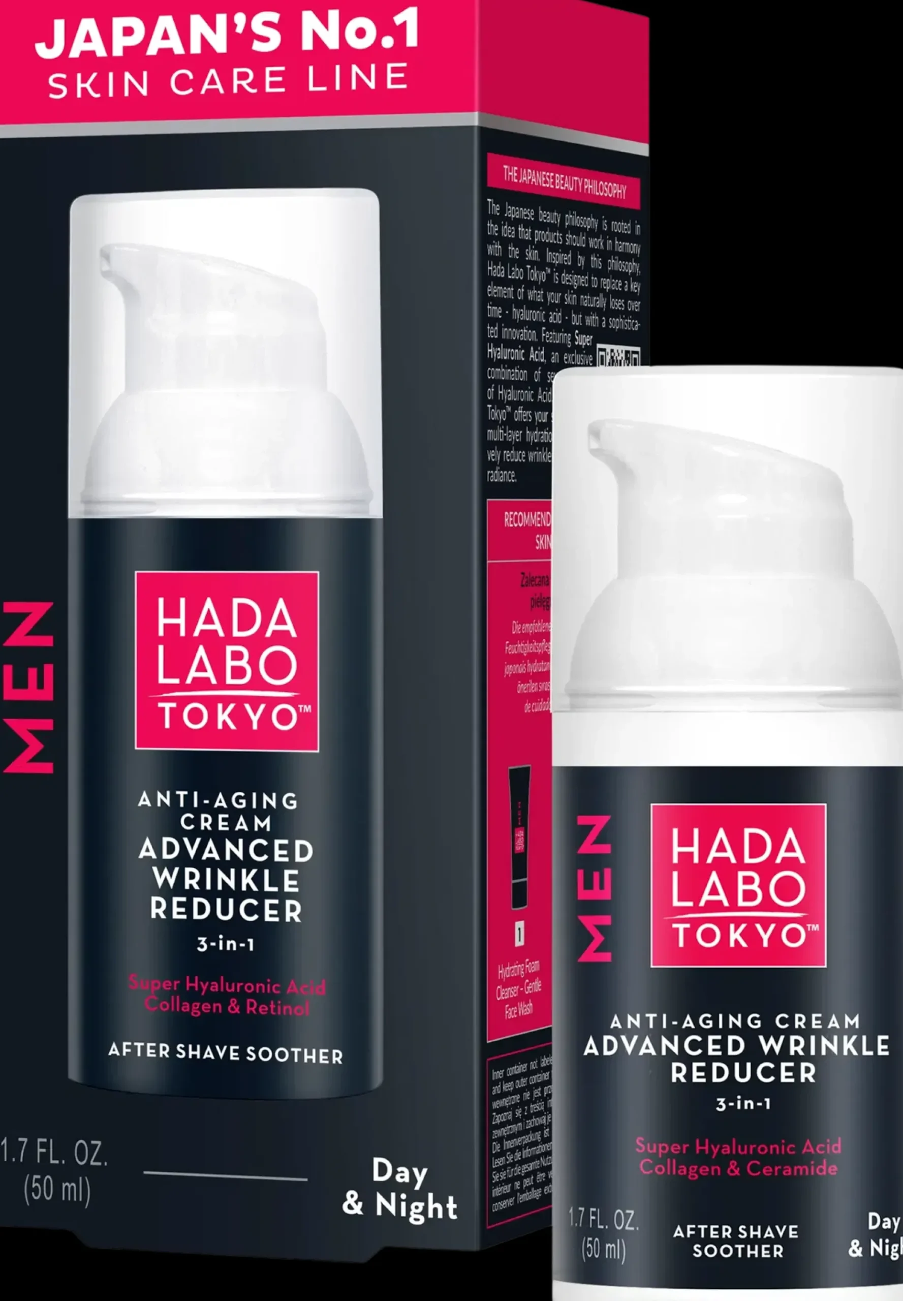 HADA LABO TOKYO MEN Anti-Aging Cream Advanced Wrinkle Reducer on tehokas voide, joka auttaa taistelemaan ikääntymisen merkkejä vastaan kosteuttamalla, silottamalla ja elvyttämällä ihoa.