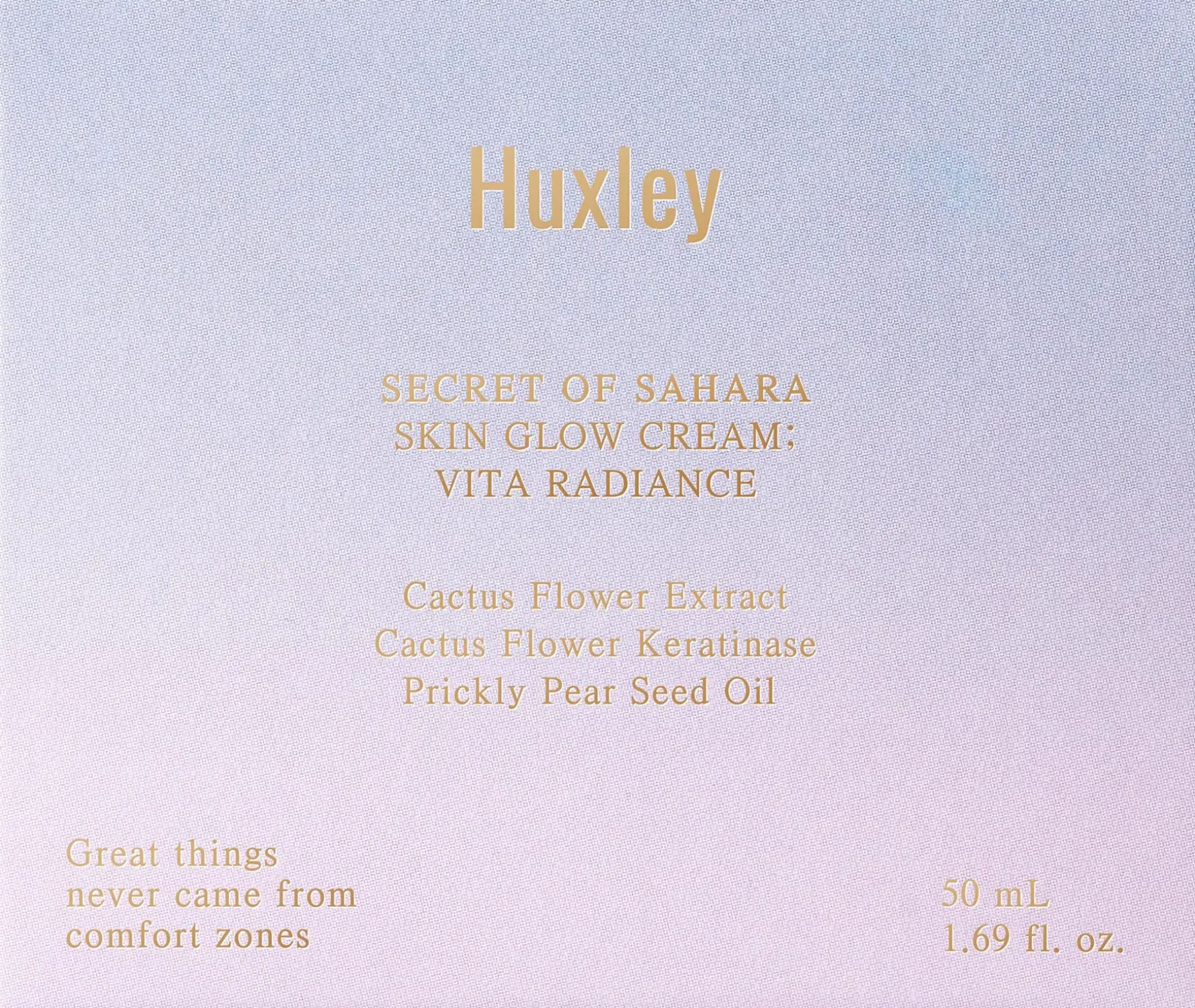 Huxley Skin Glow Cream; Vita Radiance on kosteuttava ja heleyttävä voide, joka sisältää kaktuksenkukkauutetta, kaktuksen kukasta saatavaa keratinaasia ja viikunakaktuksen siemenöljyä, jotka parantavat ihon rakennetta, jättäen sen hehkuvan kosteutetuksi ja sileäksi. Hyytelömäinen, pehmeä koostumus yhdistää hyaluronihapon ja C-vitamiinin kosteuttamaan ihoa ilman tahmeutta. Voide ehkäisee kosteuden haihtumista ja pitää ihon kimmoisana jopa 48 tuntia.