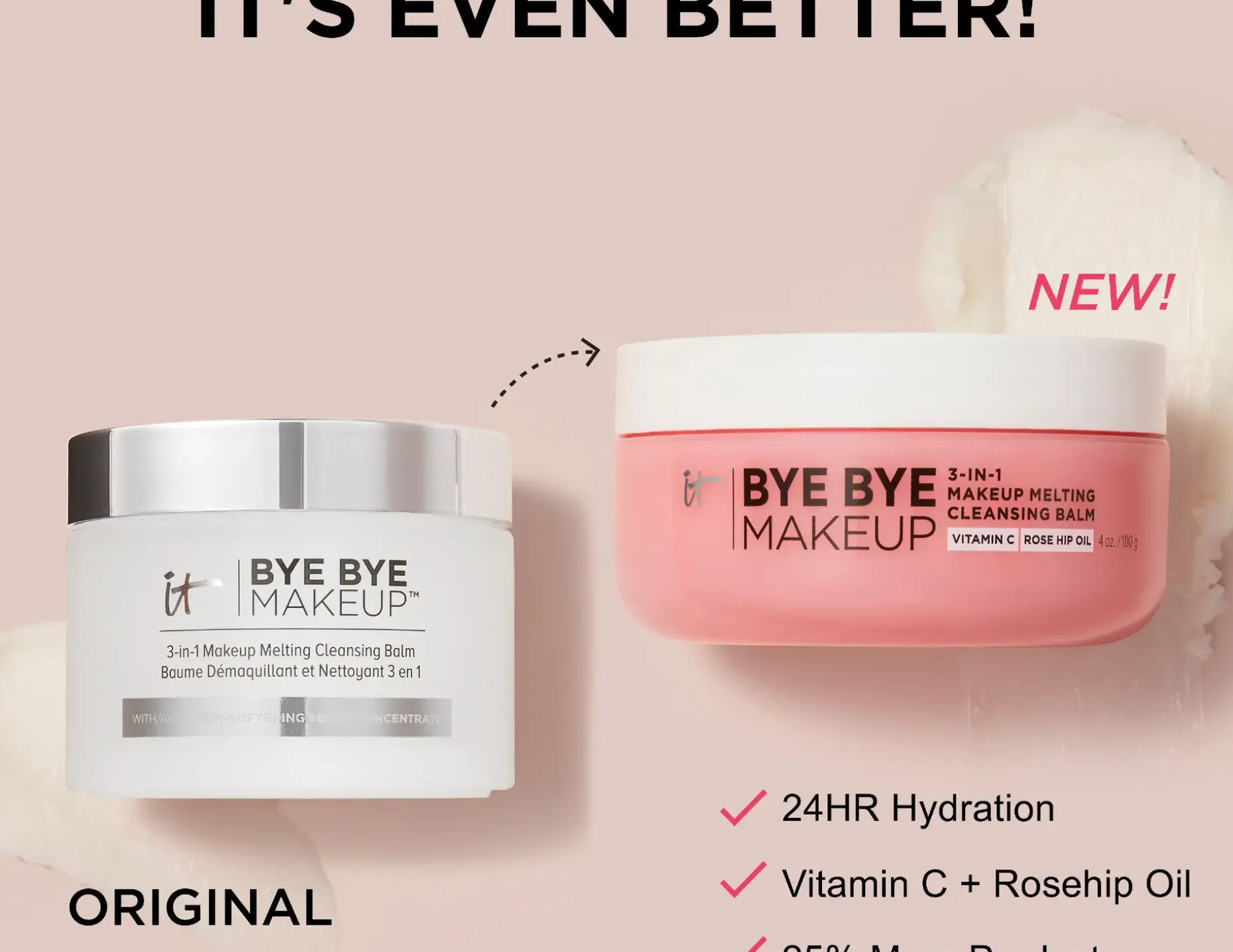 ”BYE BYE” meikille ja tervetuloa kosteutetulle iholle! Bye Bye Makeup 3-in-1 Makeup Melting Cleansing Balm on monitoiminen ja kosteuttava meikinpoistoaine, joka sisältää nyt entistä enemmän hyviä ominaisuuksia. Se on vedenkestävän meikkisi ja aurinkosuojavoiteesi poistava puhdistustuote, kirkastava puhdistustuote ja erittäin kosteuttava kasvonaamio yhdessä tuotteessa. Se poistaa helposti vedenkestävän meikin, aurinkosuojavoiteen, lian, öljyn ja epäpuhtaudet – kuivattamatta ihoa! Ei-komedogeeninen, alkoholiton, vegaaninen* ja silmälääkärien testaama koostumus sopii kaikille ihotyypeille, myös herkälle iholle. Koostumuksen ihoa hellivät ainesosat, kuten C-vitamiini ja ruusunmarjaöljy, kosteuttavat ja kirkastavat ihoa välittömästi ja pitkäkestoisesti. *Vegaaninen koostumus: ei eläinperäisiä ainesosia. Plastiikkakirurgien ja ihotautilääkäreiden kokemuksiin ja asiantuntemukseen perustuva IT Cosmetics luo tuotteita, joiden koostumukset hoitavat ihoa, rakaisevat iho-ongelmia ja antavat todellisia tuloksia.