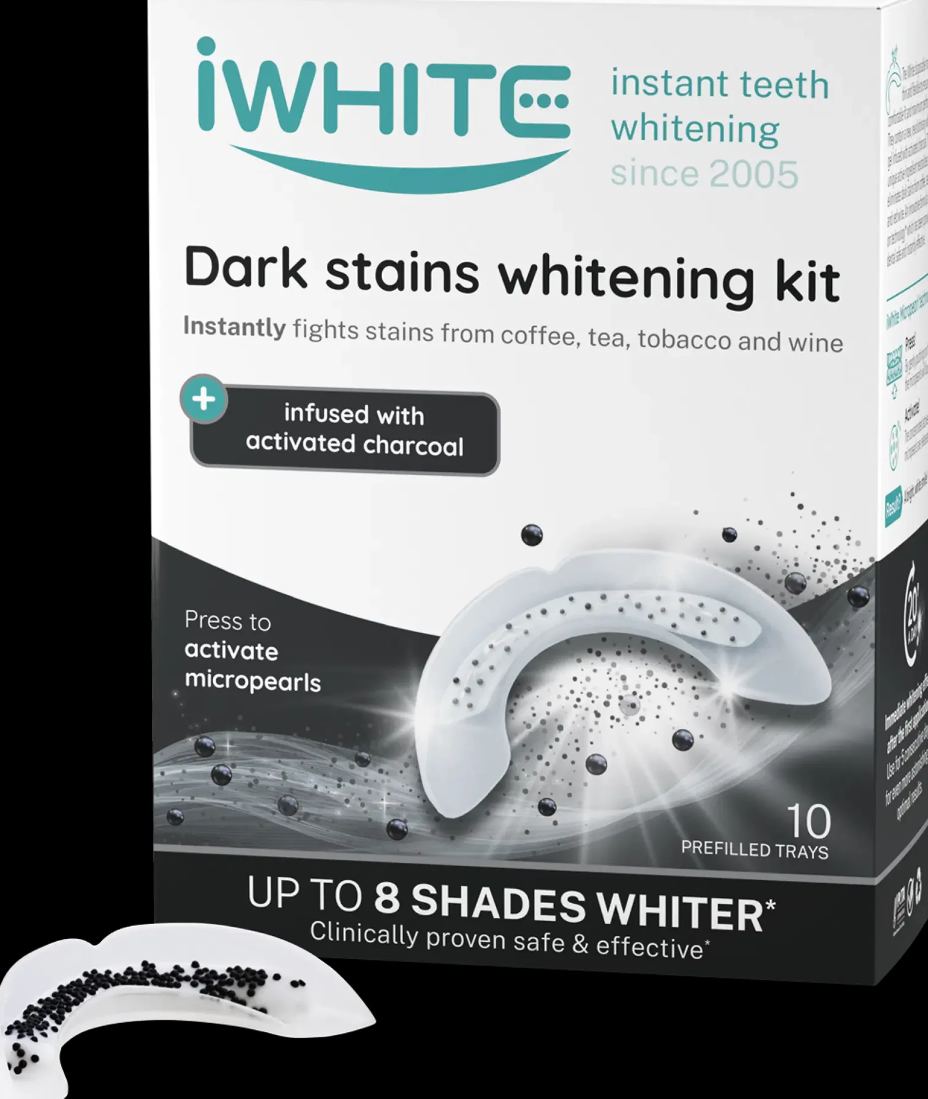 iWhite Dark Stains valkaisumuotit on helppokäyttöinen, hampaille turvallinen, välittömästi valkaiseva hampaidenvalkaisutuote, jossa on aktiivihiiltä sisältäviä aktiivisia mikrohelmiä. Vain 20 minuuttia päivässä. Voit saada käsittelyllä jopa 8 astetta valkoisemmat hampaat. Kertakäyttöiset iWhite-muotit ovat ohuita ja joustavia, joten ne istuvat hyvin ja toimivat tehokkaasti. Ne sisältävät uutta mullistavaa valkaisugeeliä, joka on kyllästetty aktiivihiilellä. Tämä ainutlaatuinen aktiivinen ainesosa neutraloi ja eliminoi kahvin, teen, tupakan ja punaviinin aiheuttamia tummia värjäymiä. Tuotteen teho perustuu kaksivaikutteiseen valkaisutekniikkaan: Vaihe 1: Aktiivihiiltä sisältävät mikrohelmet korjaavat tummentumia ja auttavat pahanhajuiseen hengitykseen. Aktiivihiilen voimakkaasti adsorboivien ominaisuuksien ansiosta voit heittää hyvästit värjäymille. Vaihe 2: Heksametafosfaatti ehkäisee uusien värjäymien syntymistä. Se muodostaa hammaskiilteeseen suojaavan kerroksen, jonka ansiosta vältyt uusien värjäymien syntymiseltä. Kliinisesti testattu ja 100 % turvallinen. 10 käyttövalmista muottia. Ei sisällä vetyperoksidia.