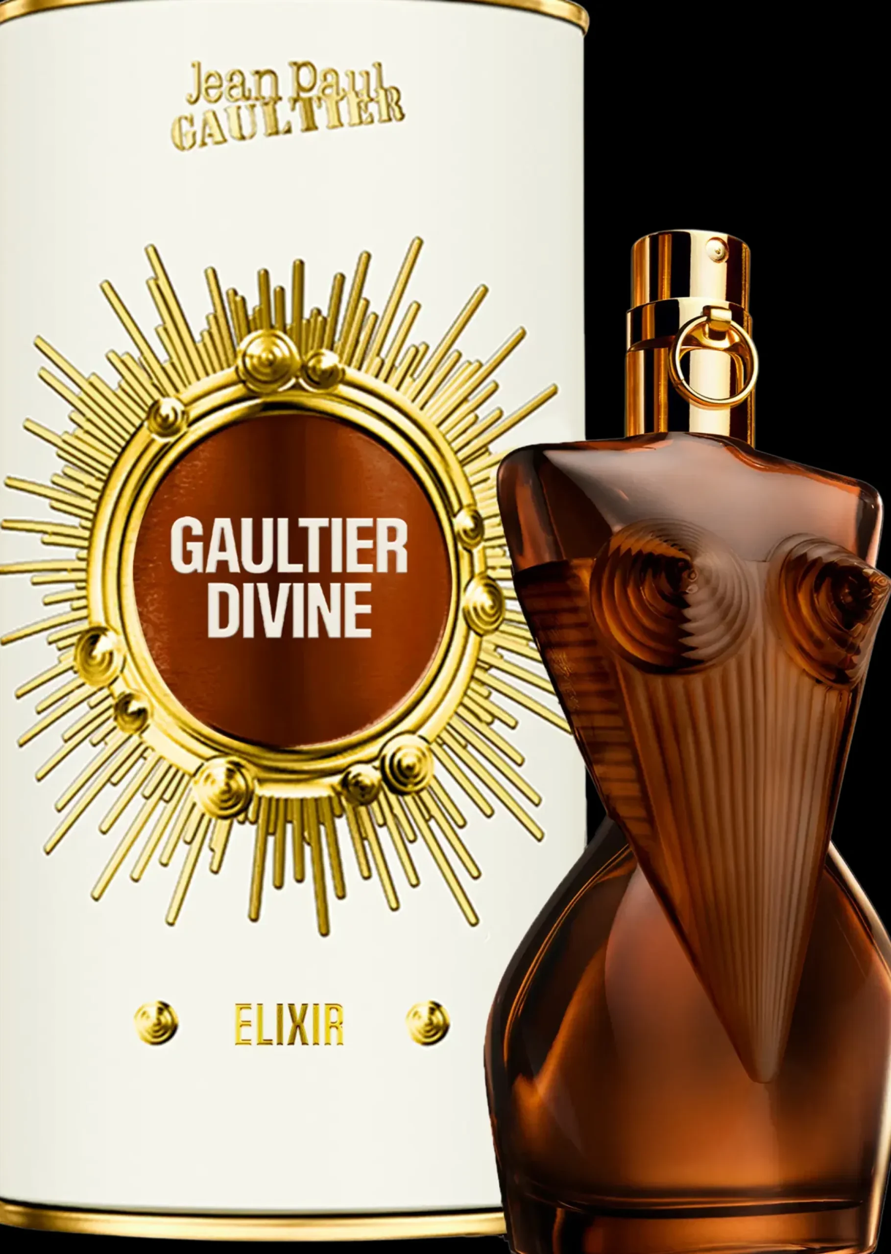 Gaultier Divine Elixir lumoaa kukkaisella, merellisellä ja meripihkaisella tuoksullaan, joka on suljettu meripihkan ja kullan sävyiseen pulloon. Magneettinen tonkapapu ja kermainen tuberoosa ilmaisevat itseään täysin vailla kahleita. Vastustamattoman naisellinen ennen kaikkea. Ulkopakkauksen kotelosta kimaltavaan korsettiin, lasin heijastukset häikäisevät ylellisyydellään. Hänen kaikkivoiva luonne uhkuu rajatonta naisellisuutta, jonka ympärillä kaikki pyörii. Hän käskee – ja maailma seuraa!